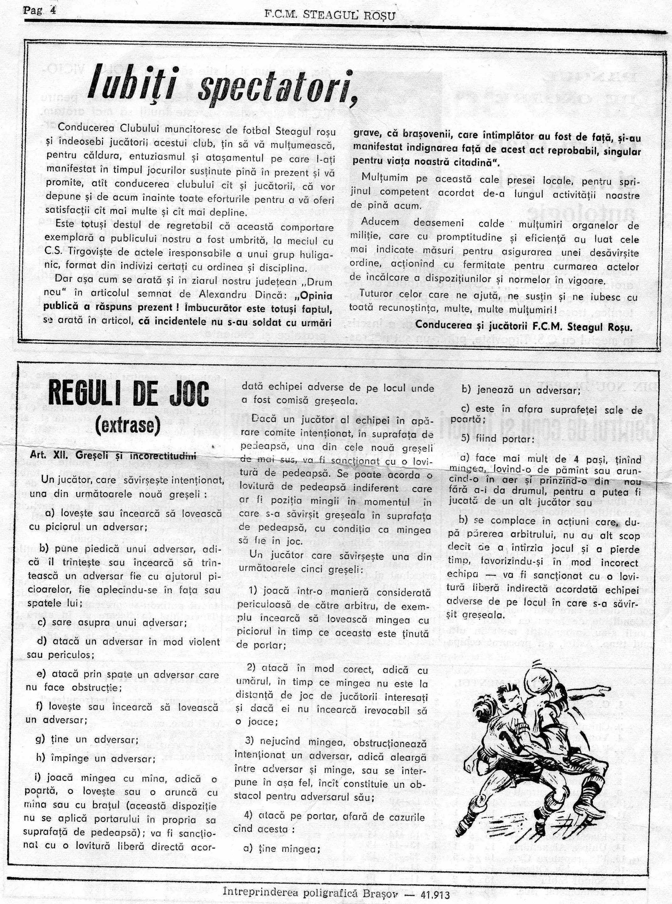 Închidem programul şi citim un articol  în care conducerea mulţumeşte Miliţiei pentru promptitudinea cu care a potolit actele „huliganice” ale suporterilor „stegari” în meciul precedent cu C.S. Târgovişte. Care va sa zică, până şi fotbaliştii le mulţumeau Miliţienior pentru bastoanele aruncate în capul fanilor, aceeaşi fani cu care fotbaliştii noştri stătea la masă şi la un pahar de vin în Cerbul. Mno, aşa erau timpurile. Mama lor de timpuri…