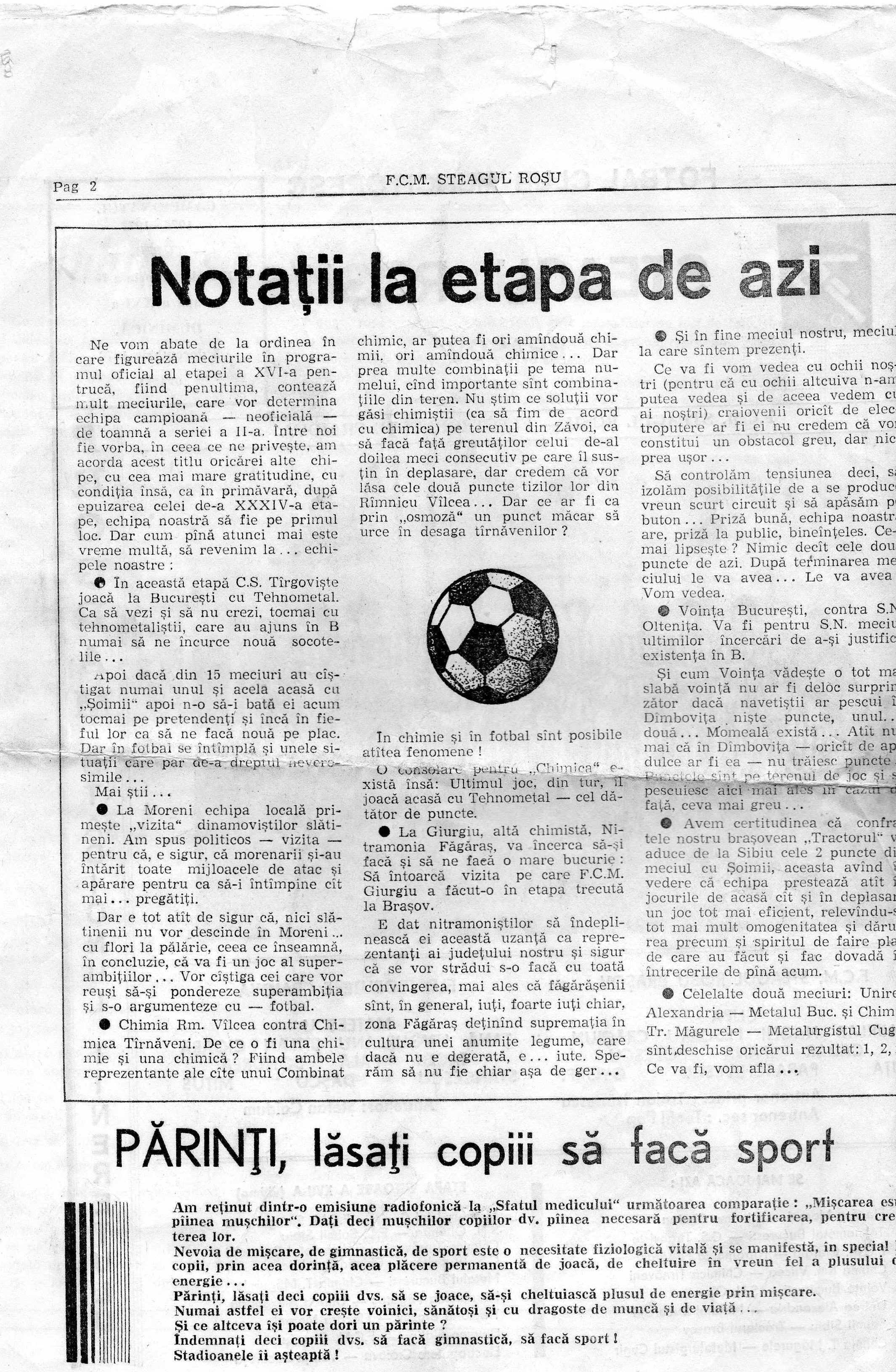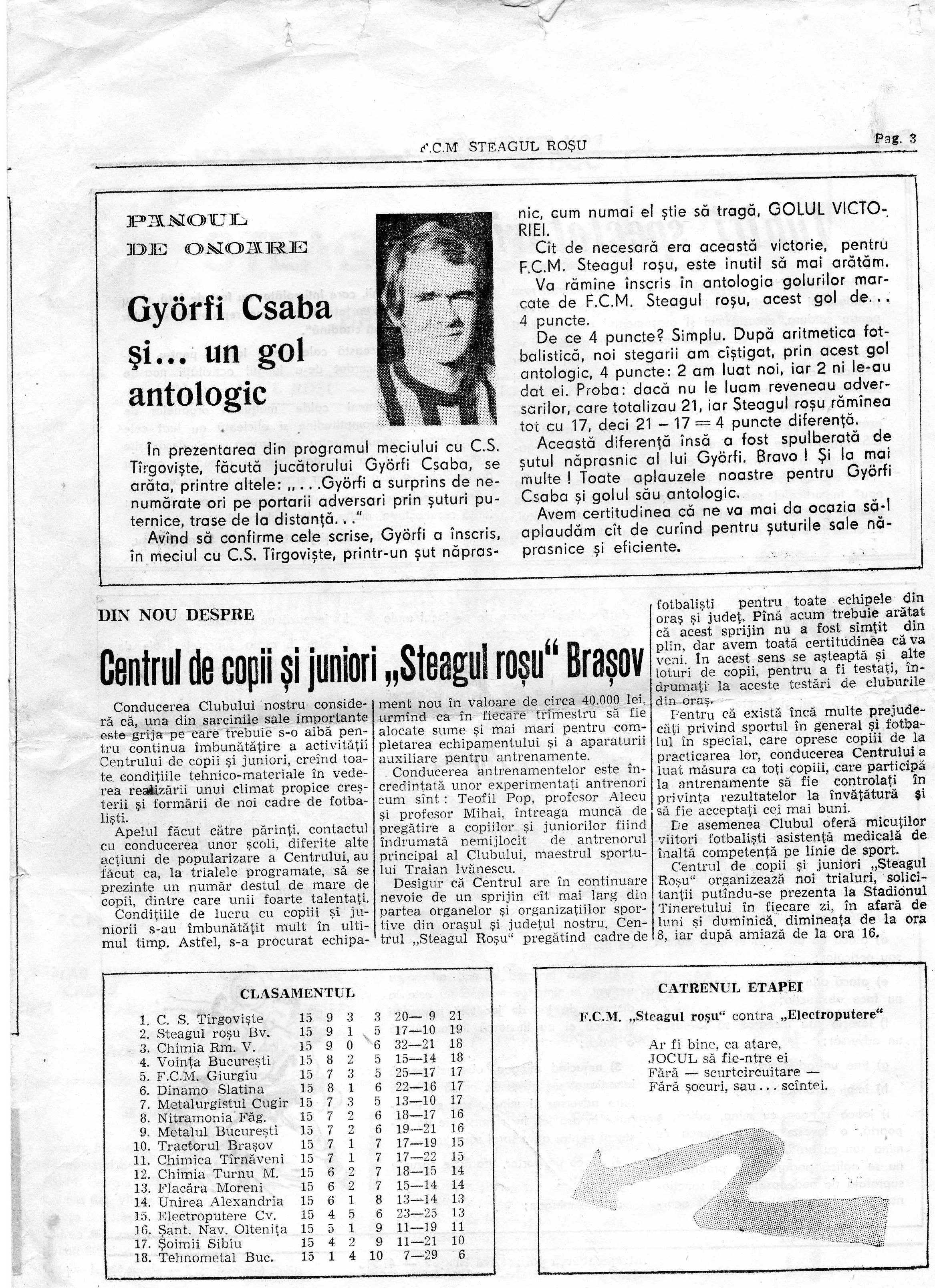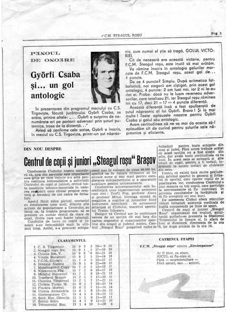 Pe pagina următoare, cea din dreapta, putem citi un elogiu adus extremei braşovene Csaba Gyorffy. Cu şuturile sale de gol a reuşit să intre la „Panoul de Onoare” al programului. Mai jos este prezentarea centrului de copii şi juniori. Reţineţi, vă rog, prima frază: „Conducerea Clubului nostru consideră că, una dintre sarcinile sale importante este grija pe care trebuie s-o aibe pentru continua îmbunătăţire a Centrului de Copii şi Juniori, creând toate condiţiile tehnico-materiale în vederea realitzării unui climat propice creşterii şi formării de noi cadre de fotbalişti.” Desigur, limbaj cam de lemn, dar nimic fals în toată această exprimare lemnoasă. Atunci chiar erau condiţii, conducerea clubului chiar se implica spre deosebire de ziua de azi când se doreşte performanţă din piatră seacă. Unii tot n-au înţeles că pentru a primi trebuie să şi dai.