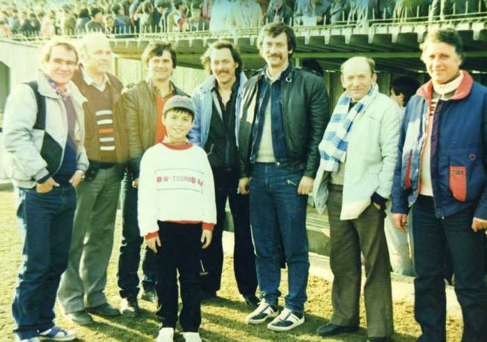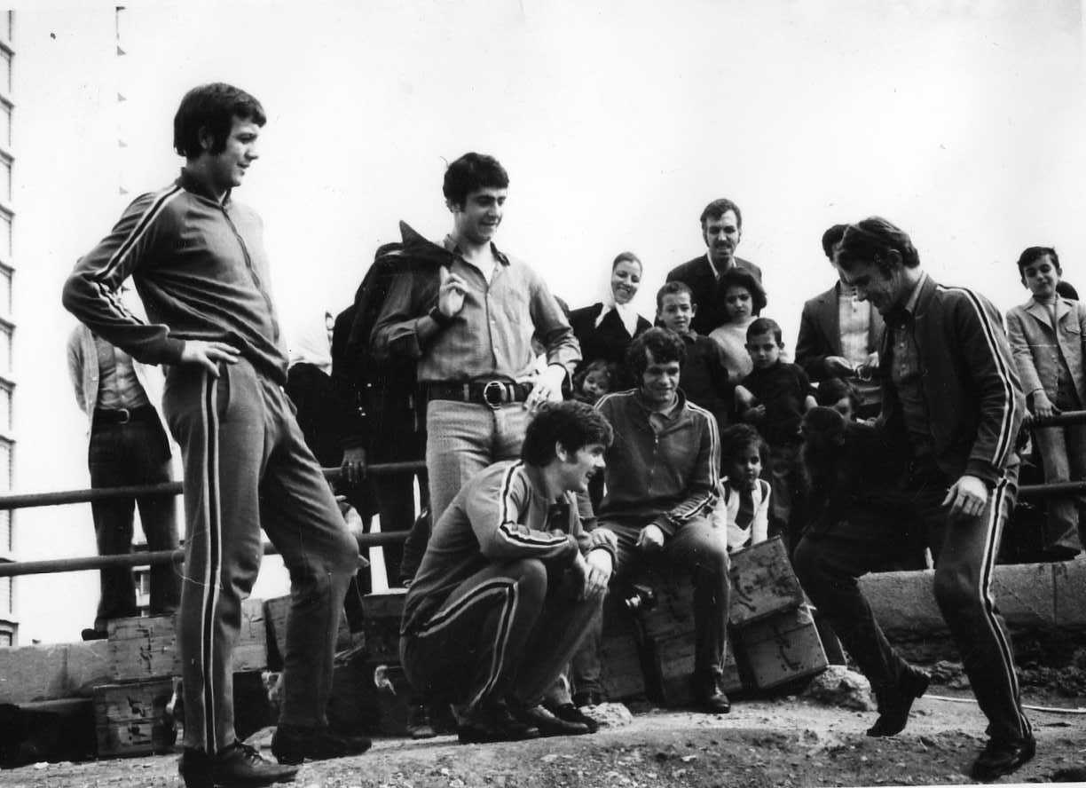Nae Pescaru (al treila de la stânga la dreaptă), alături de bunii prieteni Gyorffy şi Hârlab (ambii pe extreme) intrând pe „Tineretului” casual şi nu „stegar”