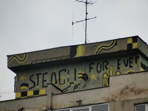 Undeva-n cartierul Steagul, pe-un bloc de vreo 10 etaje, stau întipărite două declaraţii: una de dragoste şi alta de vise. Le leagă culorile: galben şi negru.
