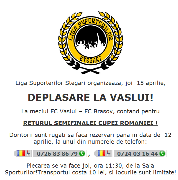 UPDATE! Toți cei care doresc să facă deplasarea la Vaslui sunt rugați să se prezinte luni, 12 aprilie 2010, la ora 18.00 în fața Sălii Sporturilor, pentru a se trece pe listă. Trebuie să aveți la dumneavoastră buletinul + 10 lei costul deplasării. Anunțați-vă prietenii, rudele, apropiații, etc. LOCURILE SUNT LIMITATE, de aceea trebuie să vă rezervați locul/locurile.