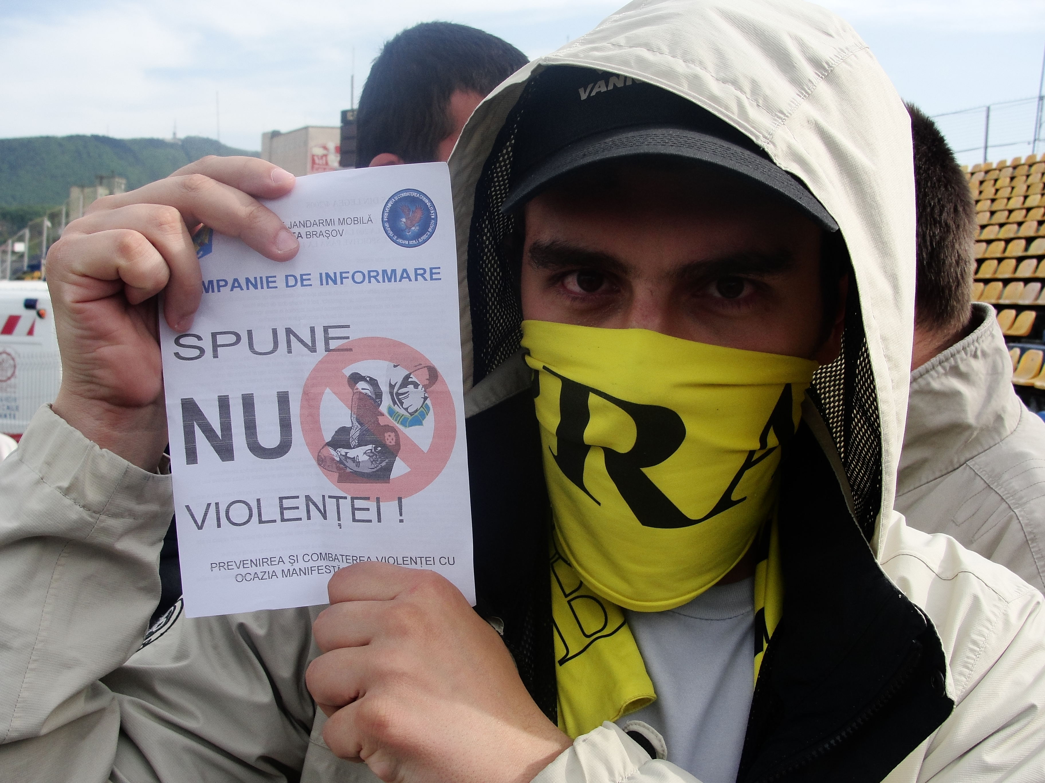 Iată cum arată campania Jandarmeriei pentru informarea cetăţenilor despre cum stă treaba cu violenţa la competiţiile sportive. Au luat un gagiu din San Andreas şi o poză cu un petrolist (după culorile fularului) de pe gugăl, i-au încadrat într-un cerc roşu barat şi au pus textul „Spune NU violenţei!” Aşadar, dacă porţi eşarfă, ai o şapcă, o glugă peste şi fere’ sfântu’ să mai ai şi vreun tatuaj la vedere, eşti, din câte îmi dau eu seama, predispus a fi un infractor, cauzator de scandal, provocator de răscoale şi ce mai vreţi voi. De când au ajuns suporterii pe aceeaşi treaptă cu violatorii, hoţii şi criminalii? Ok, înţeleg că o astfel de înfăţişare vestimentară nu e adecvată unei întâlniri cu Zamolxis, Kant sau Einaudi, dar chiar aşa?