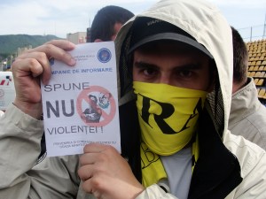 12. Cel mai amuzant cu campania asta anti-violenta e ca in timp ce ne dau pliantu ala… ei fac tot posibilu sa ne enerveze sa ne instige doar-doar rabufnim!!! Interzic steaguri dupa bunul plac fara sa respecte nici-o lege, treaba cu buletinele… acuma l-au pus pe sclavu ala sa controleze bilete la intrare in peluza… cine plm isi ia bilet cu 30ron la tribuna si sta la peluza???? NIMENI! ce rost are ala? DOAR SA NE ENERVEZE!!!! va dati seama in cretinitatea lor la ce le sta gandul… si culmea clubul ii si plateste ca sa alunge fanii!!!!!! aici trebe sa facem ceva, nu costume si prostii ca nu e haloween!