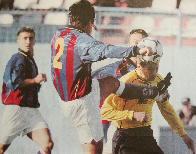 Acesta este numărul 18 de atunci al Braşovului, Robert Dani, un „stegar” pur-sânge. Câteva luni după această fază nu putea mânca decât cu paiul. Întreaga dantură i-a fost refăcută, atât de brutală a fost lovitura. Dar, hei, era ultima etapă a turului în faţa propriilor fani, era de Moș Nicolae. Nu a rezistat să nu-şi bage capul la mingea aia.