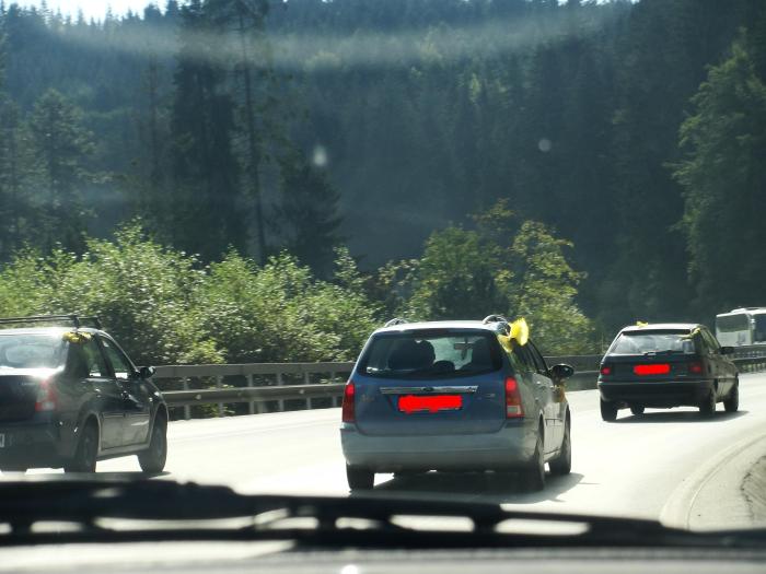 Trei din cele 10 maşini cu steaguri şi fulare galben-negre ce au mers spre Brazi