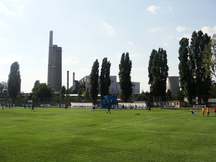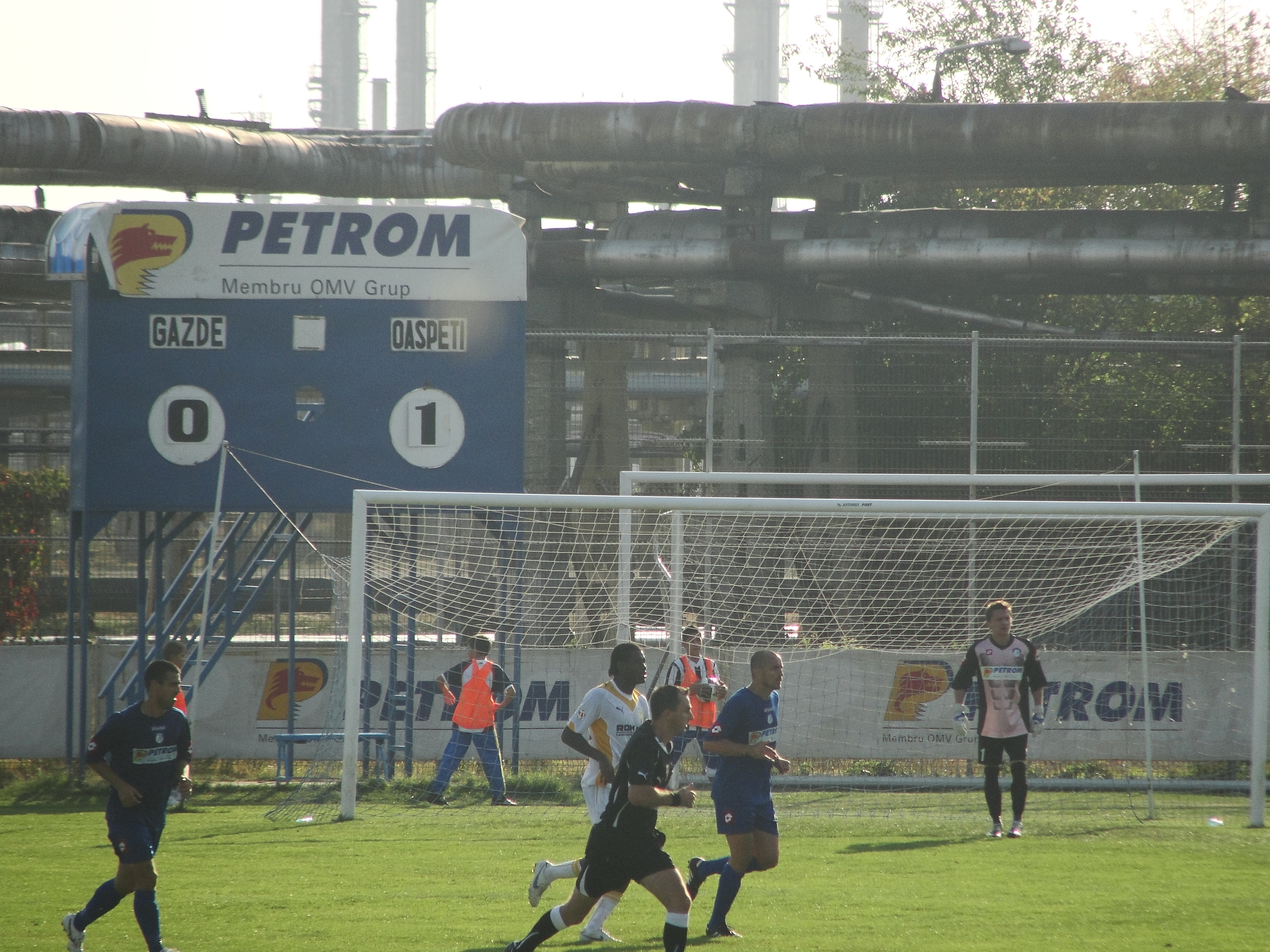 Vedere spre „Tribuna” întâi a stadionului. În spate, furnalele Combinatul Chimic din Brazi.