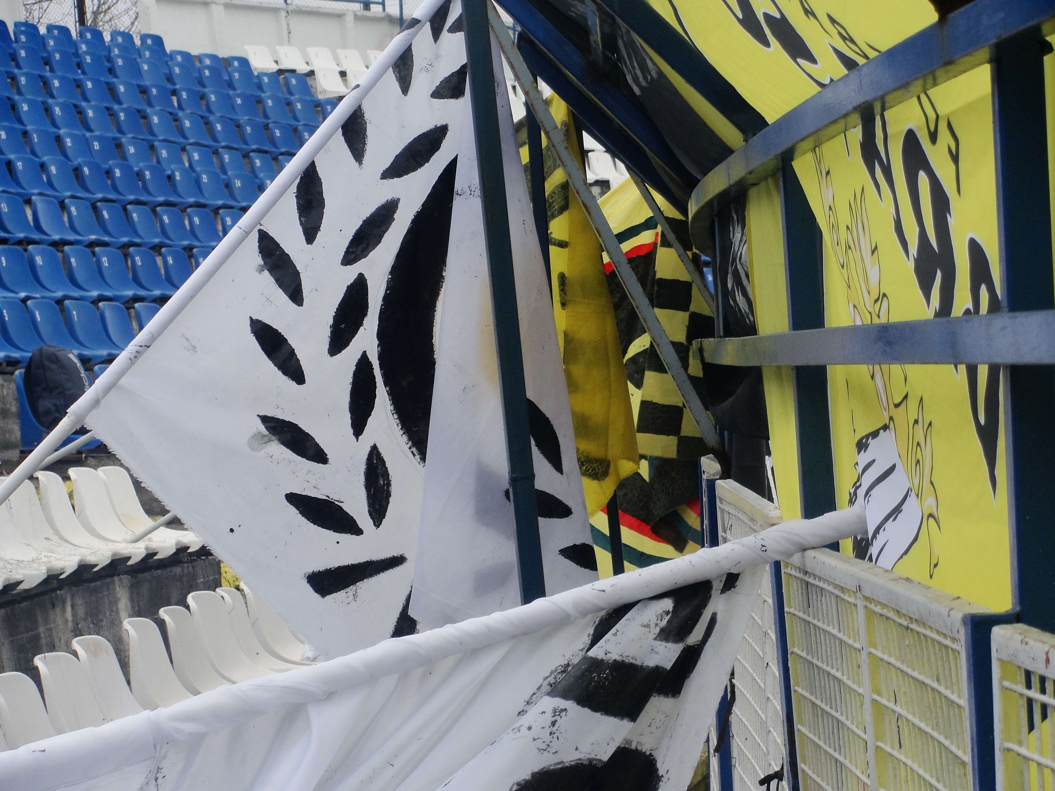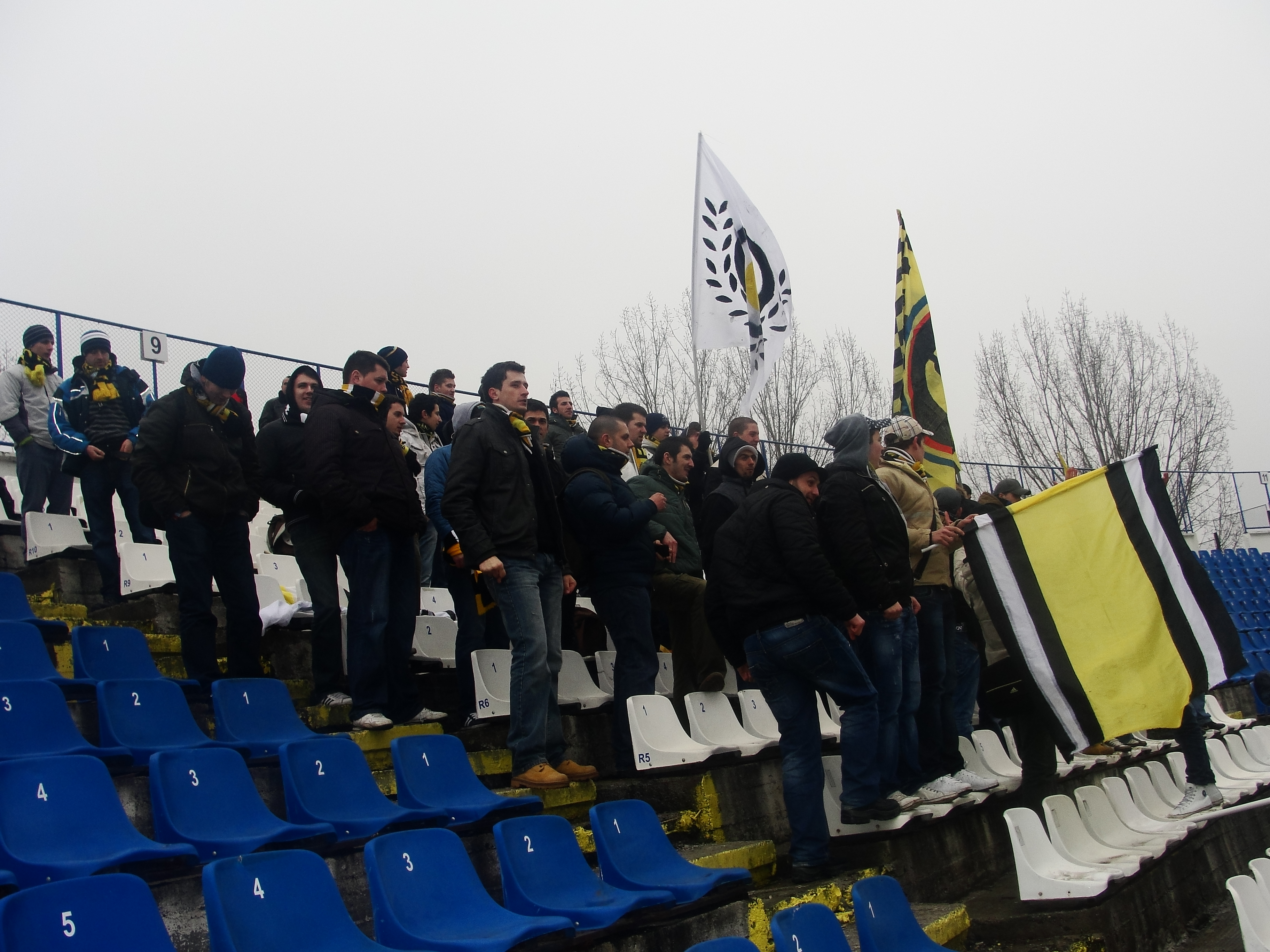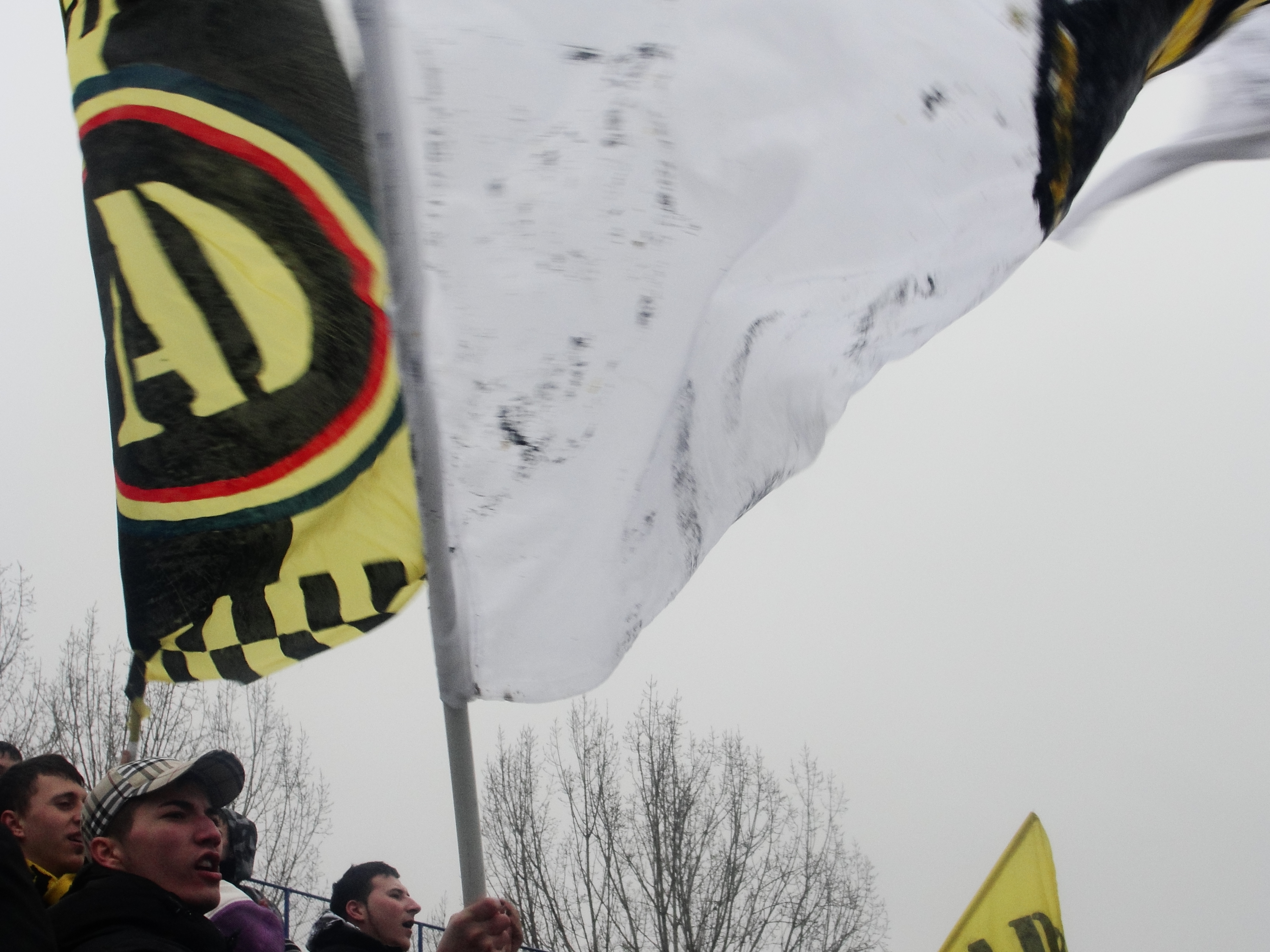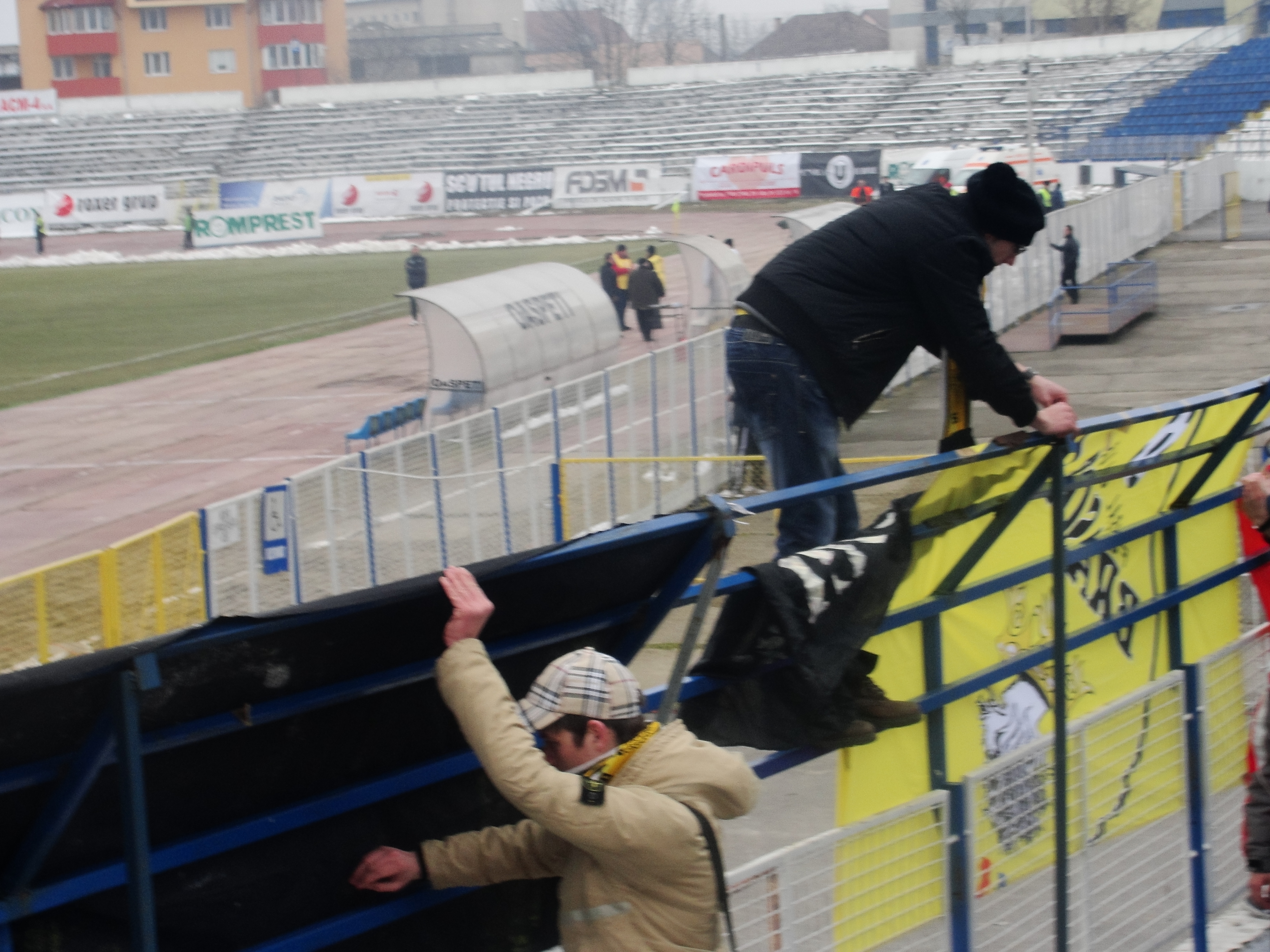 Despre meci, ştiţi cu toţii: s-a terminat 1-1 şi ambele goluri au fost din penalty. Galeria „studenţilor” prezentă la datorie, tribuna a doua a stadionului „Cetate” fiind aproape plin de „şepci roşii”. De la Braşov, exact 50 de suporteri (conform unei numărători fulger făcută înainte de a deschide sticlele) s-au îmbarcat pe trenul de la şapte fără zece dimineaţa. În cele din urmă, aproximativ 100 de „stegari” au luat loc în tribunele stadionului din Alba. La final am remarcat un grup cel puţin interesant. Profitând probabil de faptul că, duminică fiind, nevestele vor fi la biserică, un grup de vreo 10 „stegari” trecuţi de 35 de ani, din Săcele, au plecat pe furiş la meci cu dubiţa unuia din ei de cum s-a crăpat de ziuă.