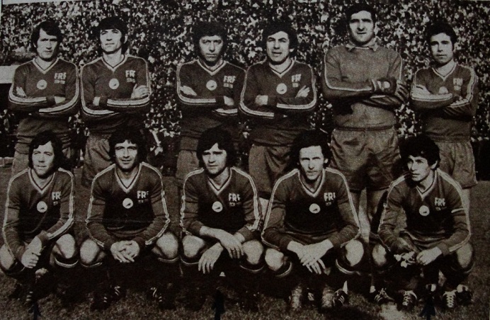 Ca şi la echipa de club, Nicolae Pescaru este în mijlocul primului rând. Singura fotografie de grup „tricoloră” a carierei sale. România ’70 vs. România ’80, martie 1980.