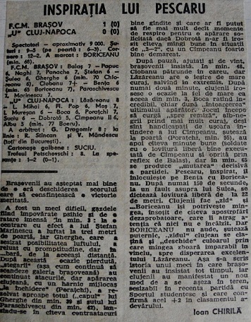 De altfel, într-un articol intitulat „Inspiraţie şi Fair-play”, maestrul Ioan Chirilă zugrăvea abil rolul de „general” îndeplinit cu succes de Nicolae Pescaru la Sibiu, cât şi căldura cu care a fost întâmpinat de localnici. La o lovitură liberă, la scorul de 1-0 pentru Steagu’, vine ordinul: „Lasă-l, Benţa! Boriceanu, colţul scurt, sus!”, şi tabela arăta 2-0 pentru braşoveni. Apoi, când partida era pe muchie de cuţit, la un corner în minutul 83, Pescaru îşi face iarăşi simţită prezenţa adresându-se aceluiaşi Leo Boriceanu: „Te-ai dus vâr-dreapta!”. S-a dus şi scorul s-a făcut 3-1, iar „stegarii” avansau în optimi. Acolo, după un meci dramatic cu Corvinul, tot la Sibiu, braşovenii ies din competiţie.