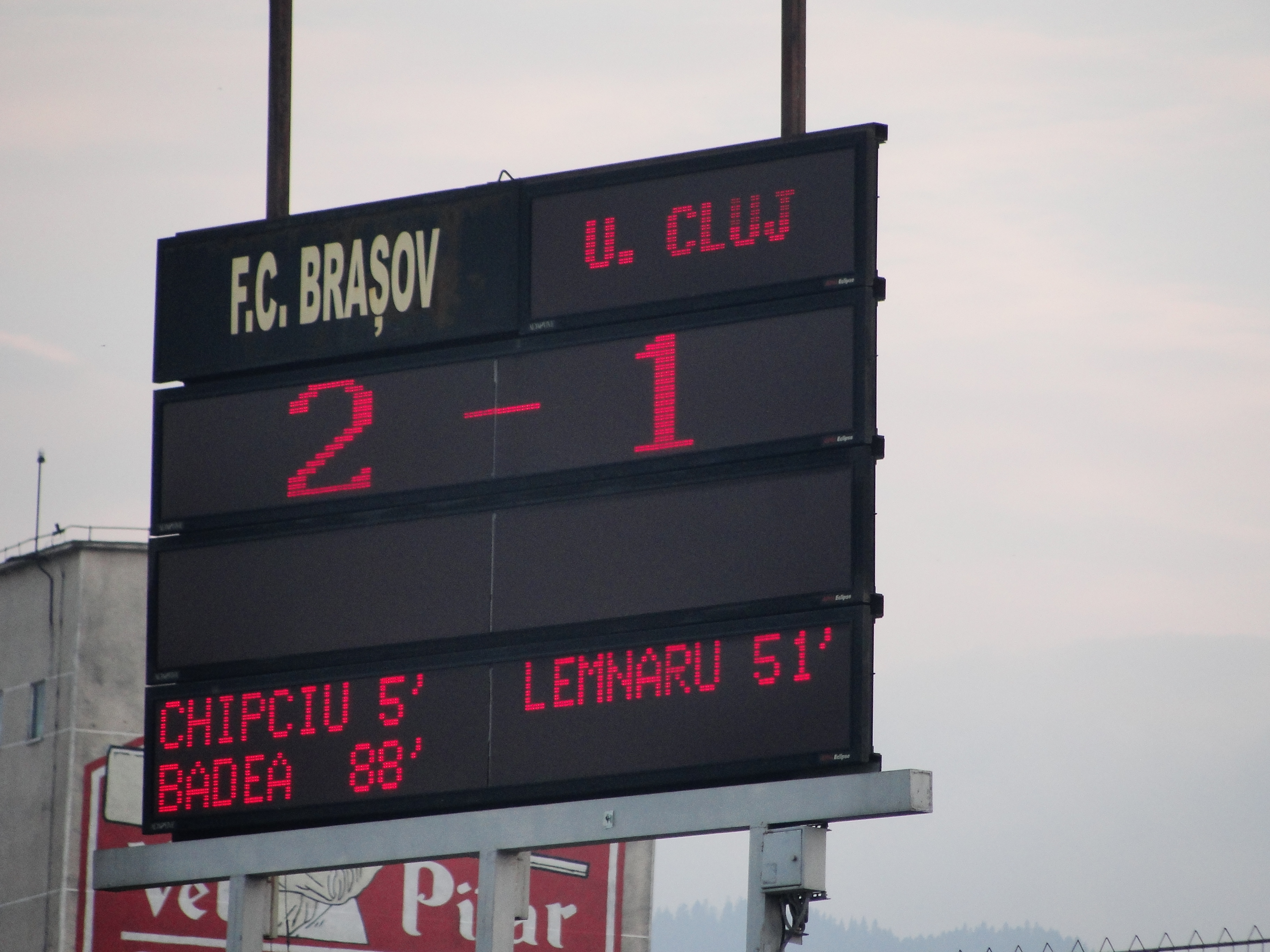 Până la ea însă, o altă tabelă a avut rolul de a fi „ochii” stadionului. Era amplasată la peluza cealaltă (care acum este dărâmată) şi era manuală. A fost montată în anii ’70, când s-au construit şi cele două peluze, şi a rezistat până în primăvara lui 2001. Ultimul scor afişat de vechea tabelă s-a consemnat în data de 9 iunie 2001: Braşovul bătea Bistriţa cu 2-0 şi se califica matematic pentru Europa. Nu ştiu ce s-a întâmplat cu ea după aceea, pusă la păstrare sigur nu a fost. După aproape 30 de ani de afişare a scorului o fi fost „demolată” şi ea.