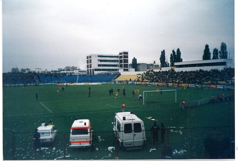 Lovitura de începere a partidei imortalizată din peluza stadionului. Se pot vedea mult locuri goale pe restul stadionului, efect al speculei practicată de conducere.