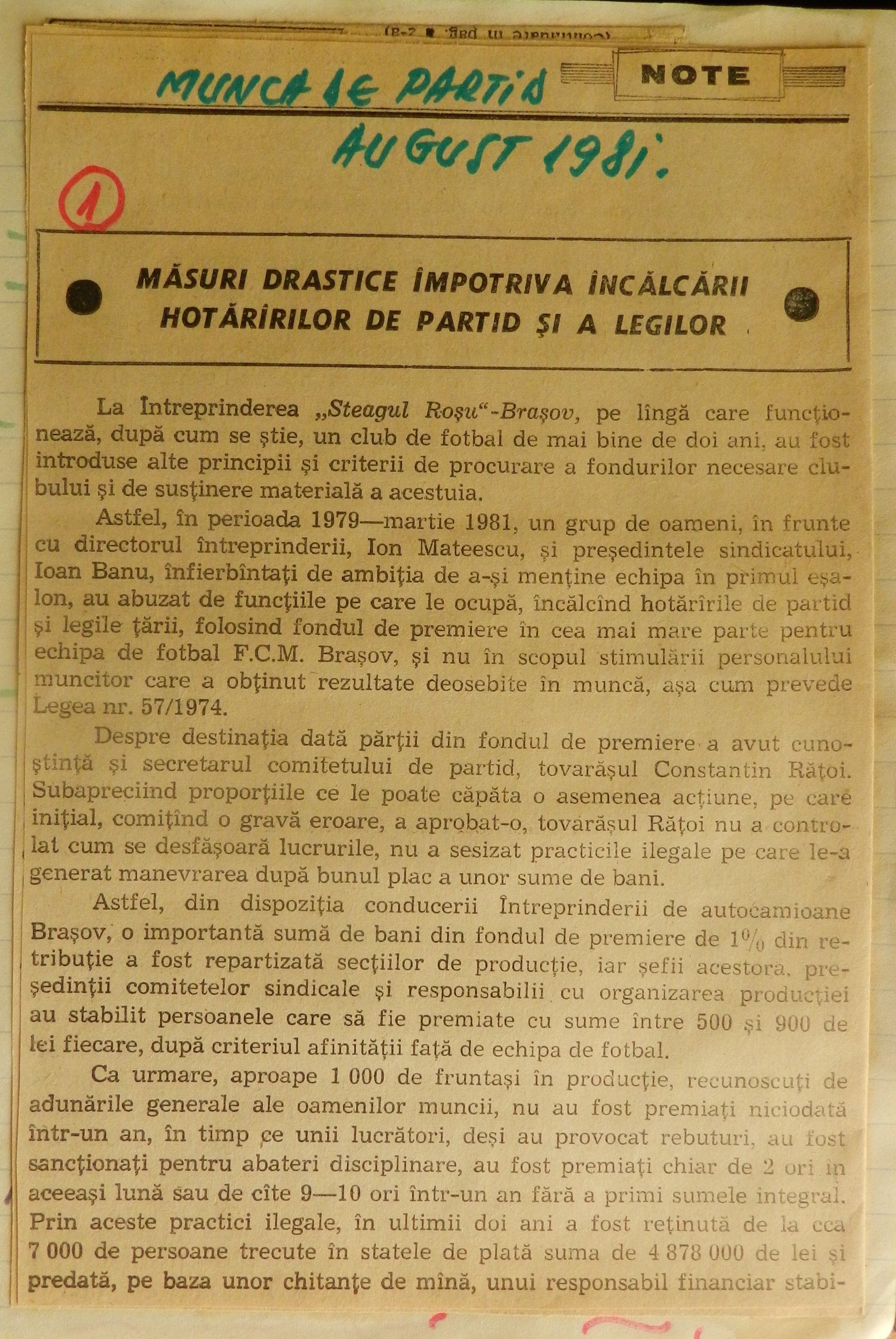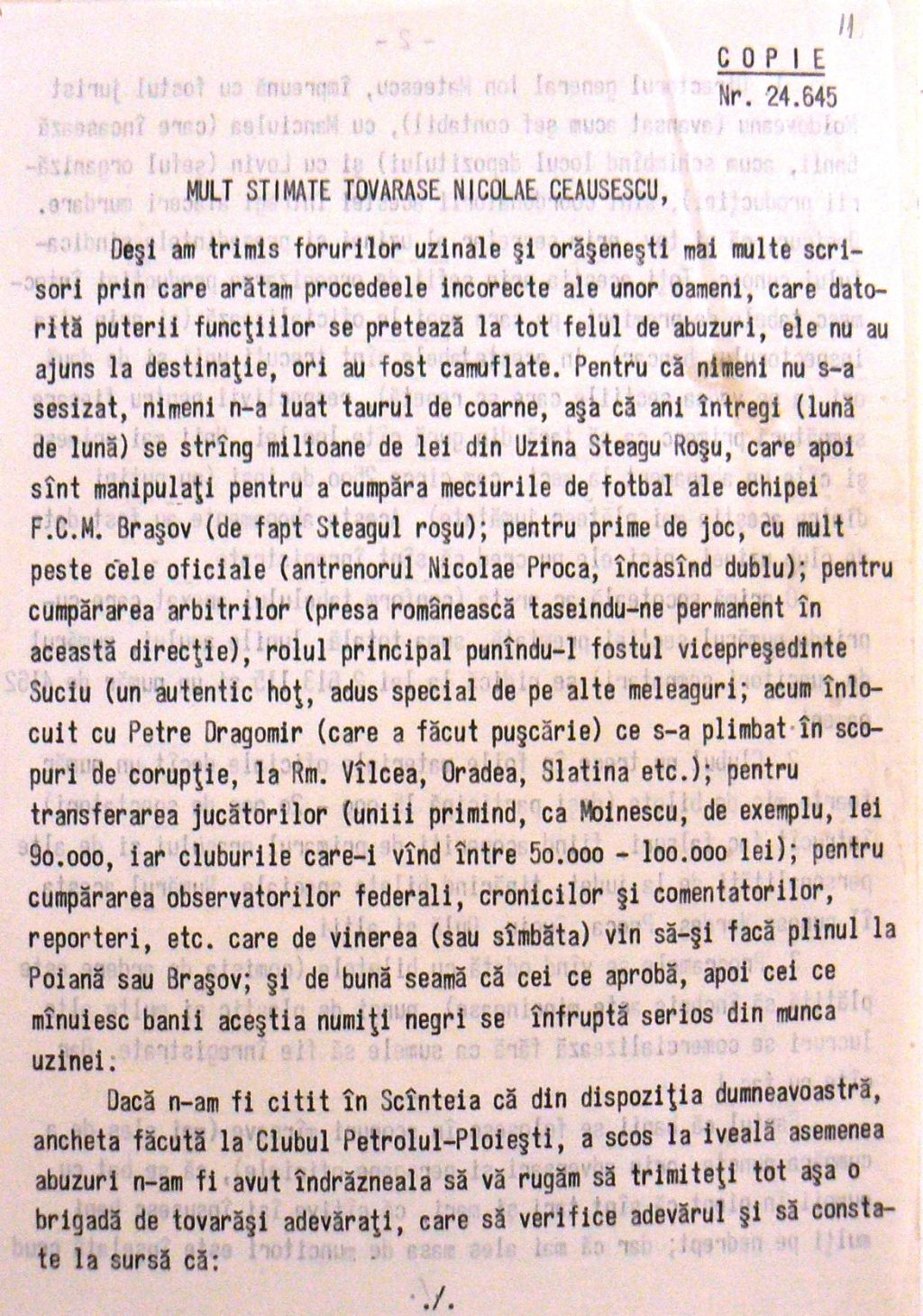 La puţin timp după terminarea sezonului 1980/81, preşedintelui României de la acea dată, Nicolae Ceauşescu, îi parvine o scrisoare dactilografiată, semnată de un grup anonim de muncitori de la Uzina „Steagul Roşu”. Iată ce spune această scrisoare: