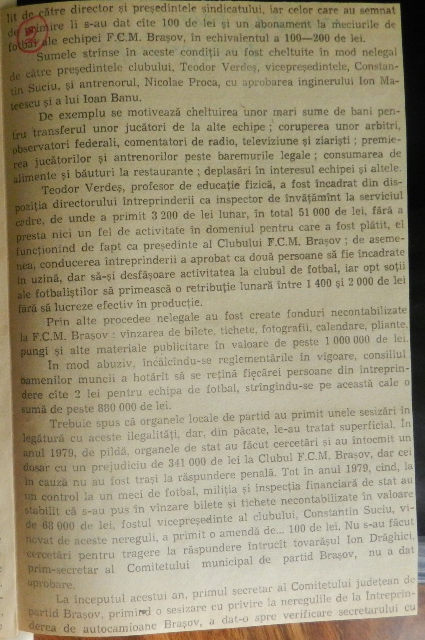 Glumind puţin, putem spune că FCM Braşov adoptase înaintea celorlalte cluburi din ţară o formă de organizare Occidentală bazându-se pe cotizaţiile muncitorilor fabricii, care însă nu primeau justificări despre destinaţia banilor pe care îi dau. Mai mult, unele sume, care trebuiau în mod normal să fie folosite pentru răsplătirea muncitorilor harnici (adică oferirea de prime), erau deturnate, după cum reiese din raport, spre alţi muncitori „după criteriul afinităţii faţă de echipa de fotbal”.