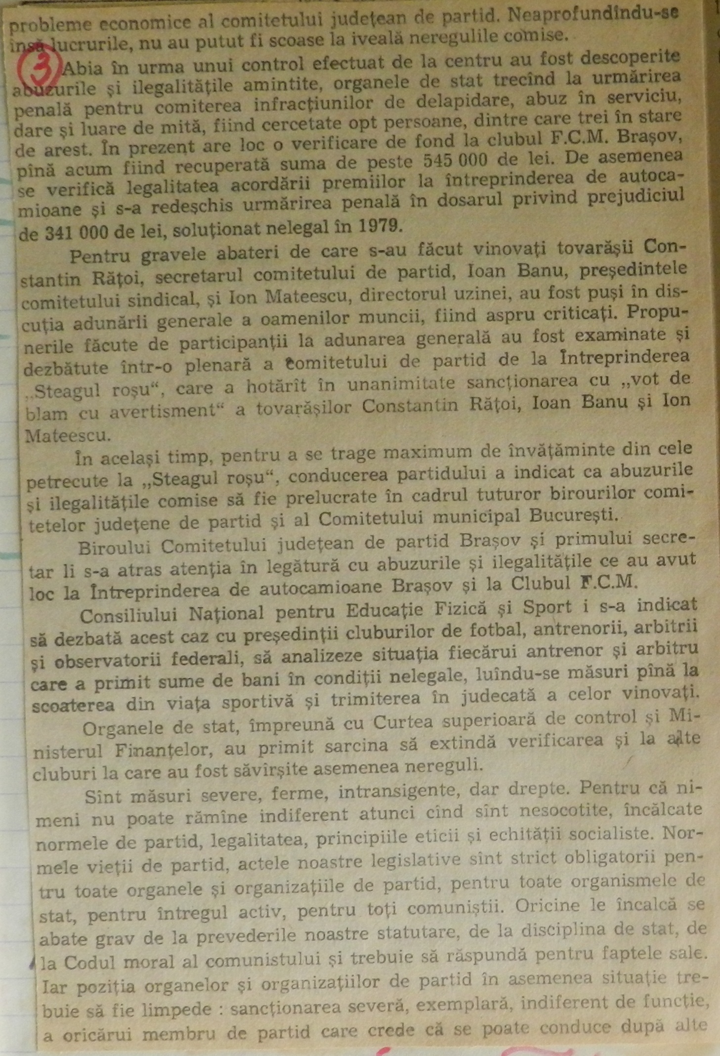 Revenind la cazul domnului Proca. Cum ziceam, scrisoarea „muncitorilor” către preşedintele Nicolae Ceauşescu avea toate şansele să fie opera unor agenţi ai Securităţii. TOTUŞI! Deşi reuşise o promovare en-fanfare cu echipa locală de fotbal, Nicolae Proca nu era cel mai iubit dintre braşoveni. Episodul „Târgovişte ’77”, când echipa antrenată atunci de el, CS Târgovişte, spulbera pur şi simplu Steagul în meciul direct pentru promovare, se poate să fi contribuit la „demascarea” practicilor necurate folosite de către conducătorii uzinei şi ai clubului. Că or fi fost agenţi sau chiar turnători din rândurile muncitorilor, cert e că Ceauşescu a dat undă verde pornirii unei anchete la clubul de fotbal al uzinei de autocamioane. Grație „stegarului” Vasile Sala din Arad, raportul din august 1981 privind „banii negri” din fotbalul braşovean poate fi acum citit (şi interpretat) de toţi „stegarii” şi nu numai.