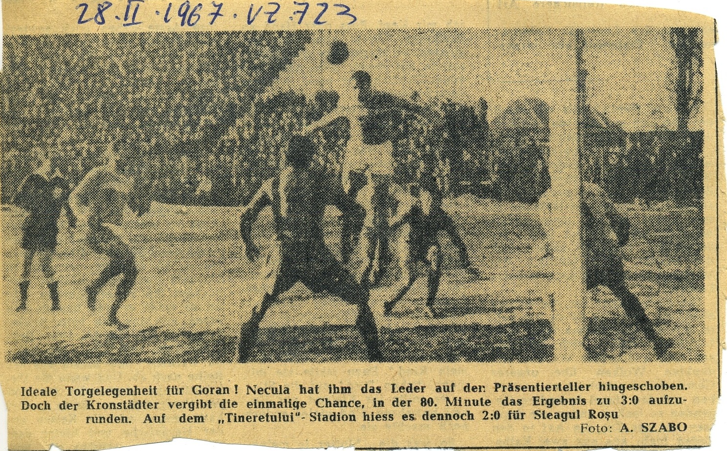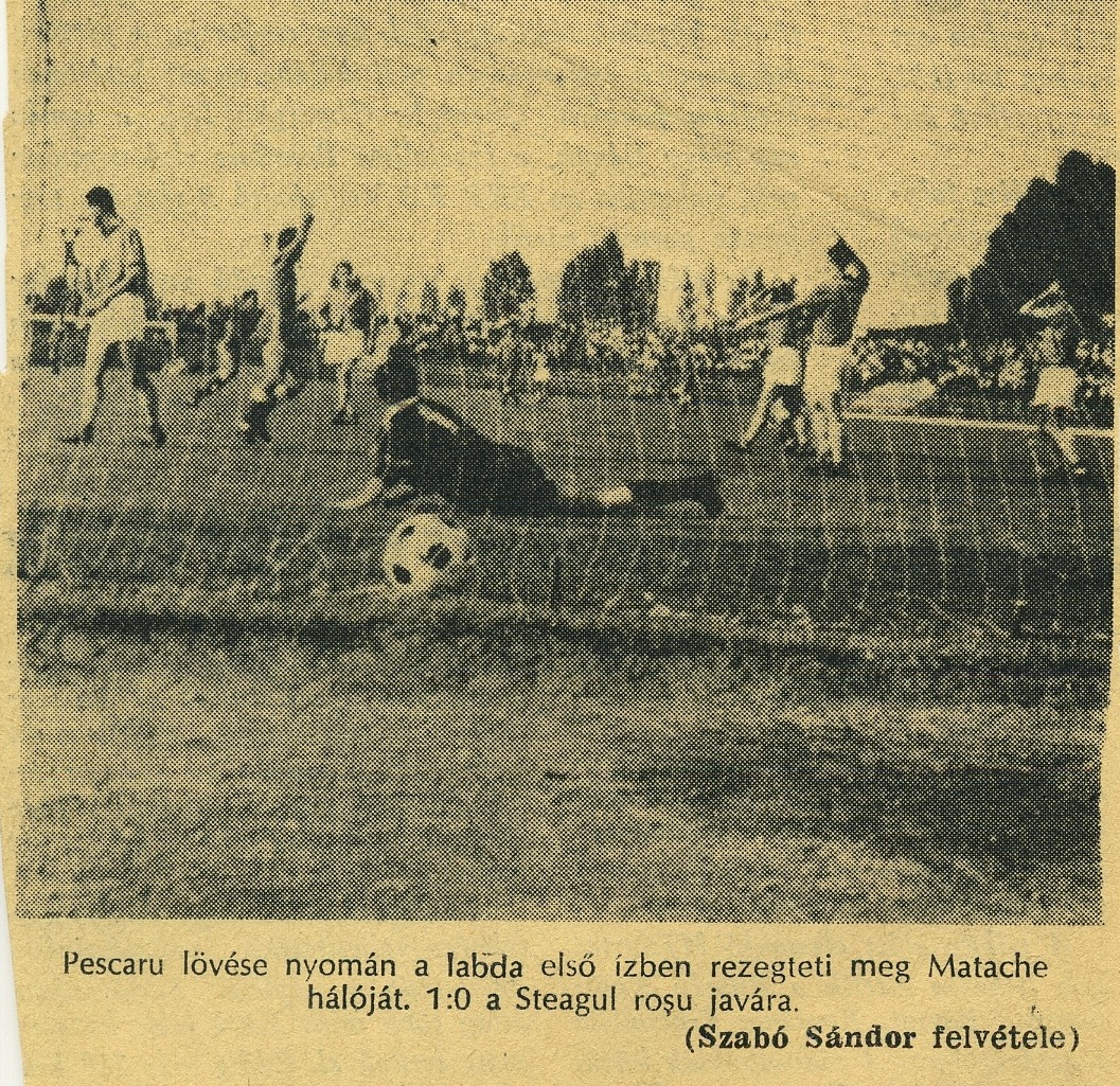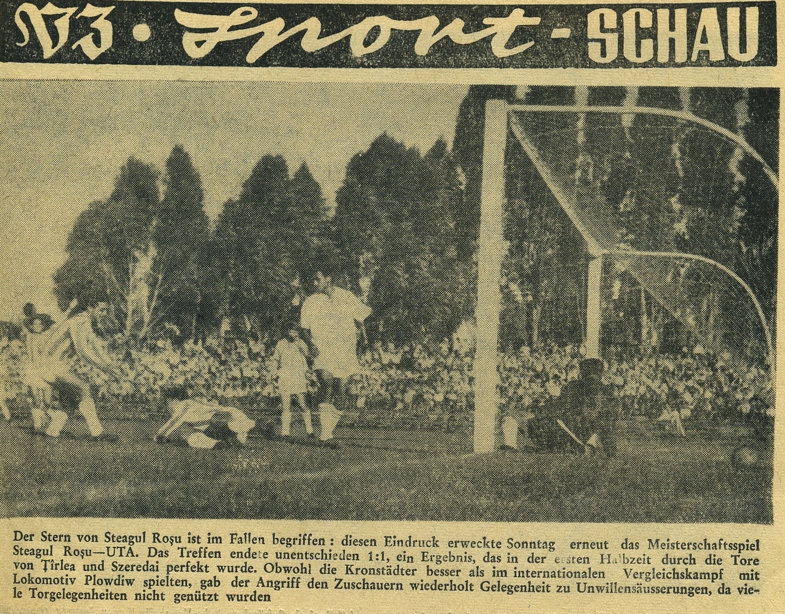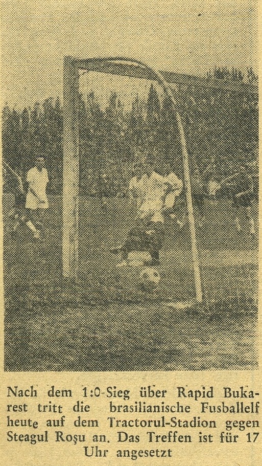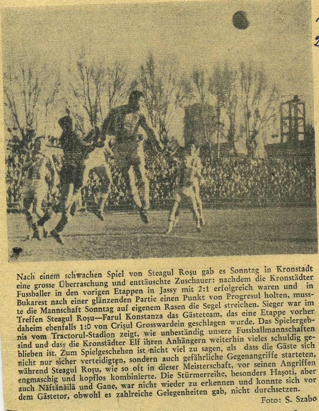 „Stegarii” deschid scorul într-un meci contra Rapidului, pe Tractorul. Descrierea fotografiei menţionează că după acest meci, echipa braşoveană urma să joacă un amical cu brazilienii de la Buonsucceso Rio de Janeiro.