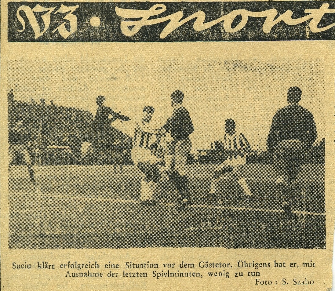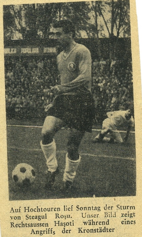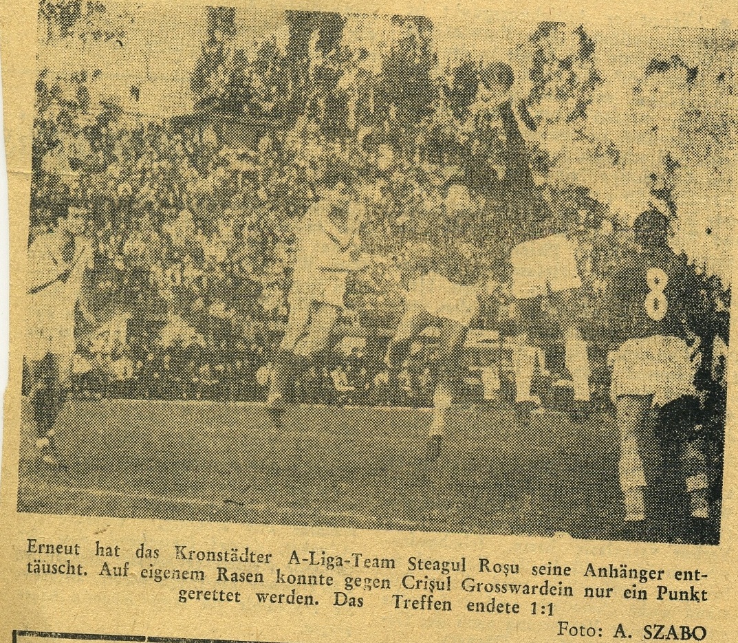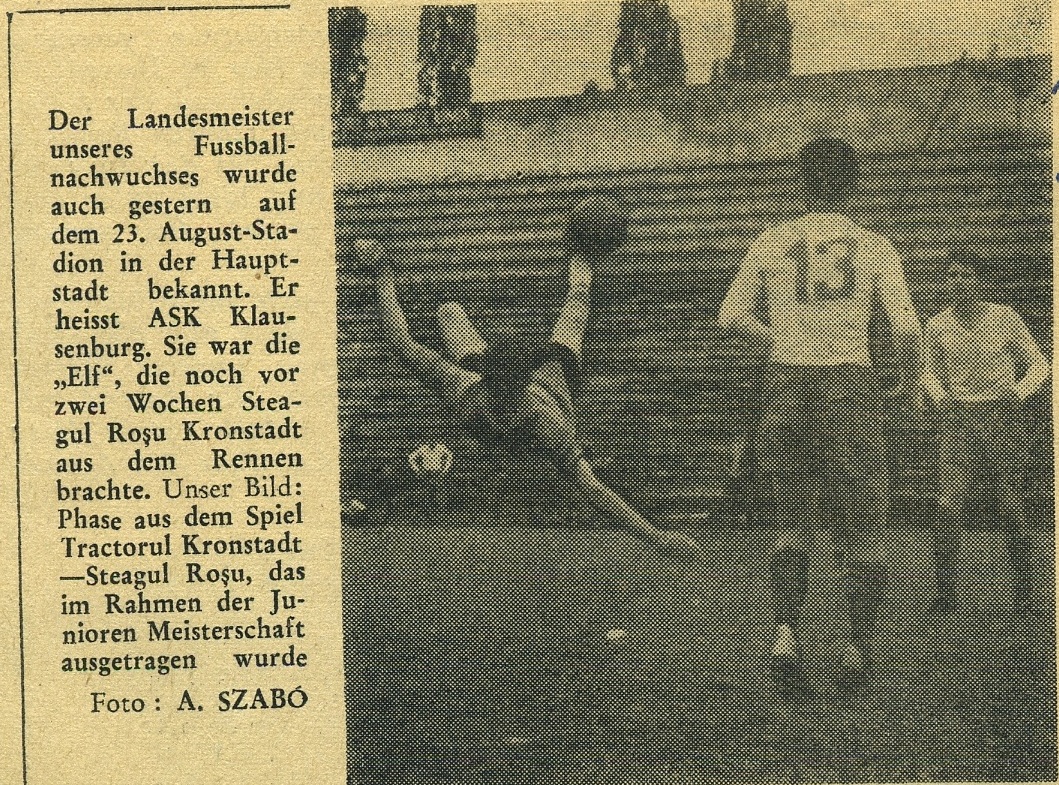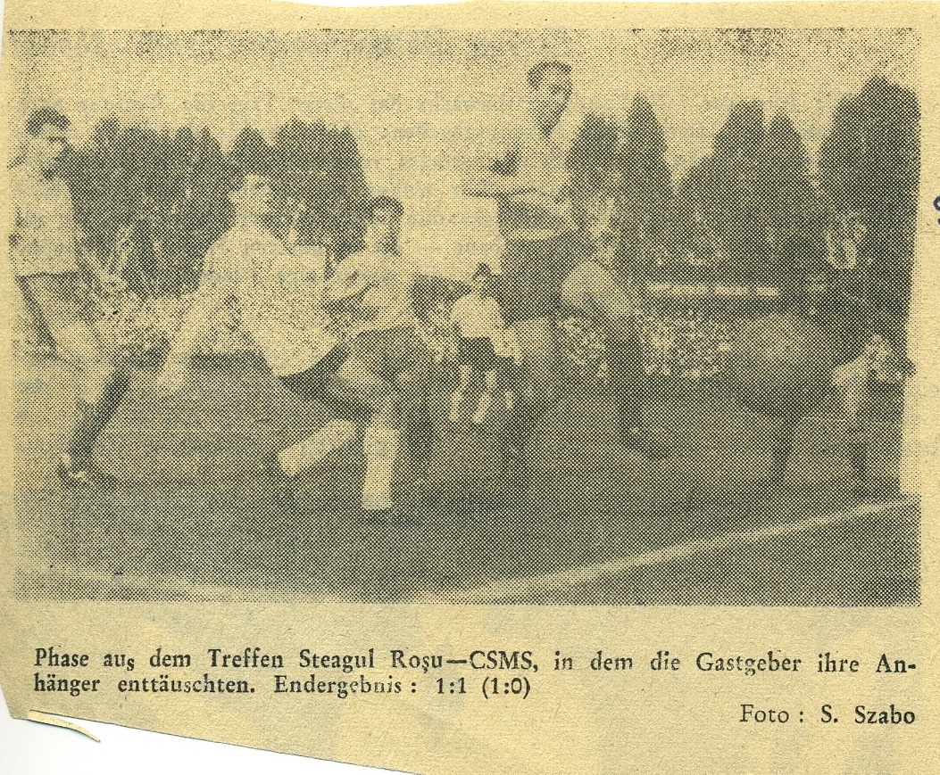 „Stegarii” deschid scorul într-un meci contra Rapidului, pe Tractorul. Descrierea fotografiei menţionează că după acest meci, echipa braşoveană urma să joacă un amical cu brazilienii de la Buonsucceso Rio de Janeiro.