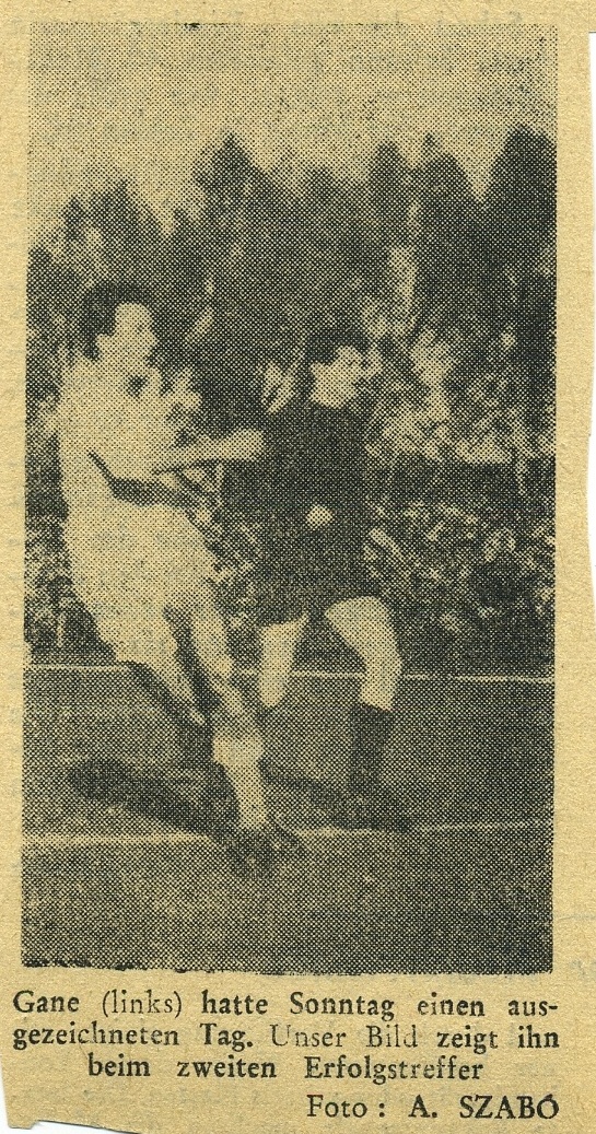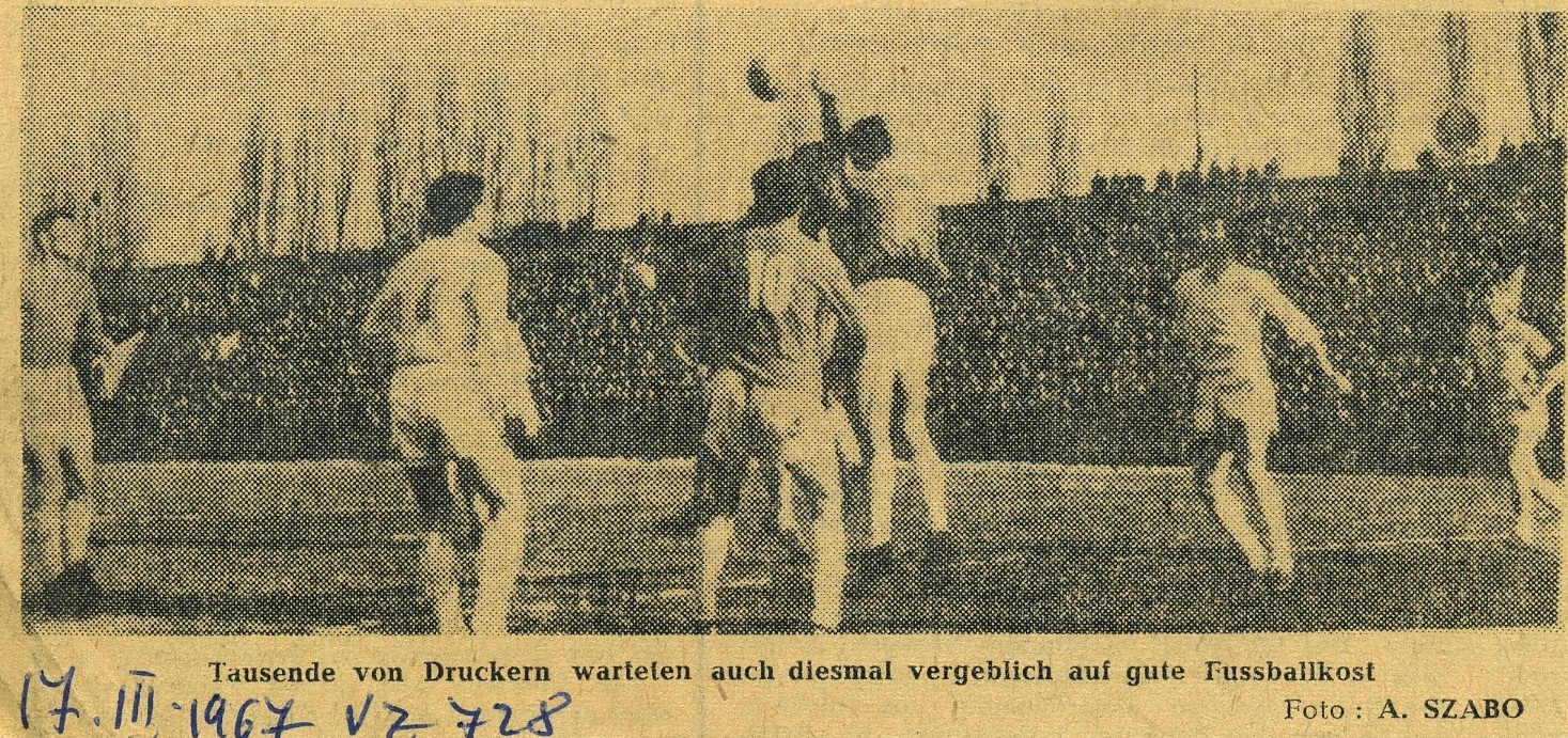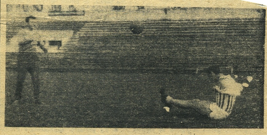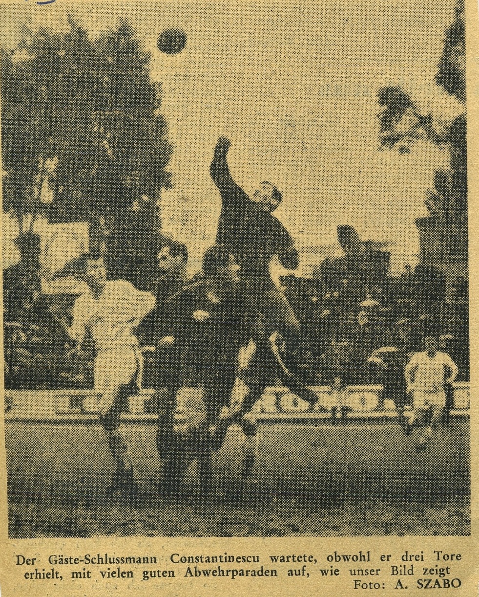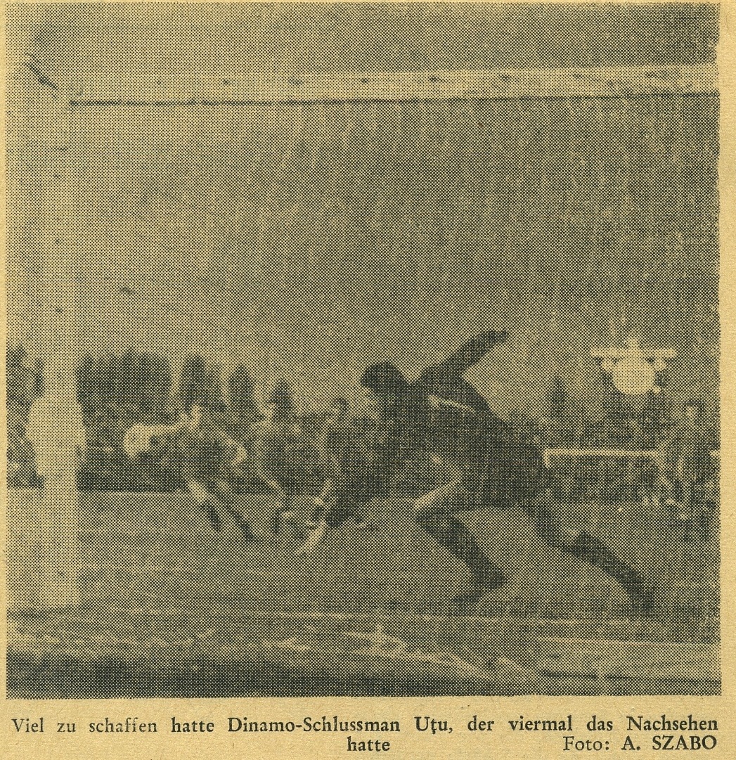 „Stegarii” deschid scorul într-un meci contra Rapidului, pe Tractorul. Descrierea fotografiei menţionează că după acest meci, echipa braşoveană urma să joacă un amical cu brazilienii de la Buonsucceso Rio de Janeiro.