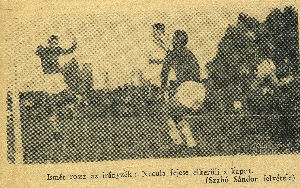 Ocazie mare de gol a „stegarilor” prin Nagy. În drepata, legendarul Alfredo di Stefano, priveşte îngrijorat cum braşovenii devin tot mai periculoşi. La final de meci, Szabó Sándor avea să-i strângă mâna lui Alfredo di Stefano, fapt ce reprezintă una dintre cele mai dragi amintiri ale fotografului din Mereşti.