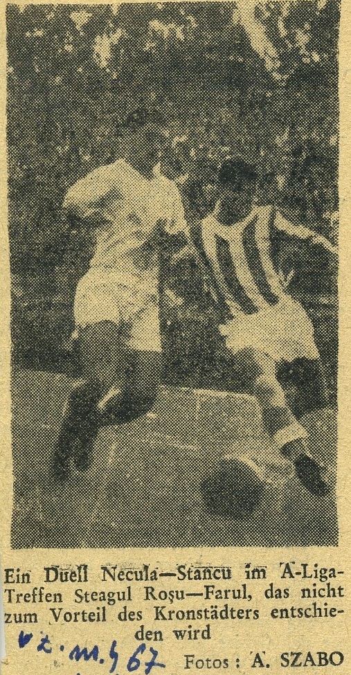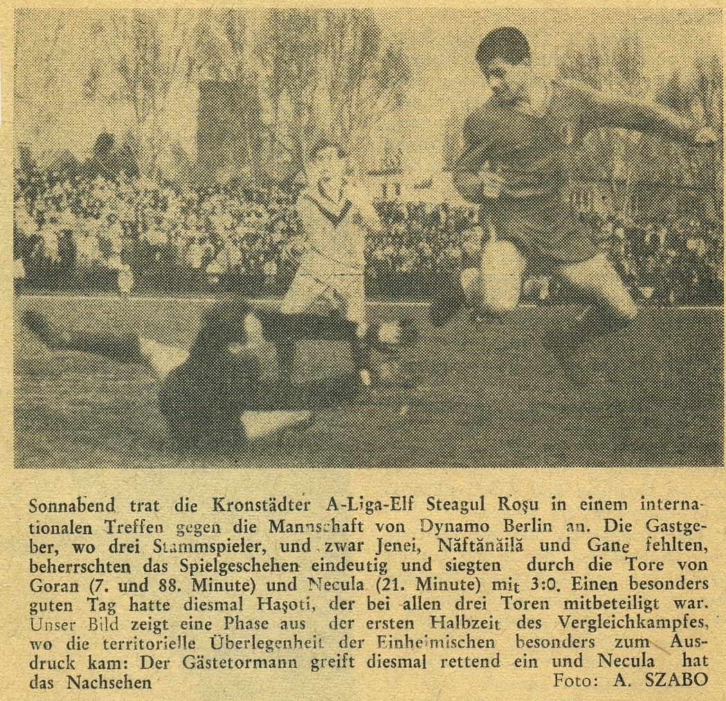 Mai. Amical internaţional pe „Tractorul”, cu Dynamo Berlin, din Germania de Est. „Stegarii” îi bat pe nemţi cu 3-0, în lipsa a trei jucători importanţi: Jenei, Năftănăilă şi Gane. Goran (dublă) şi Necula fiind cei care au marcat golurile victorie, iar Hașoti a făcut un meci bun fiind implicat în toate. Aici, Necula (dreapta) ratează o mare ocazie de gol.