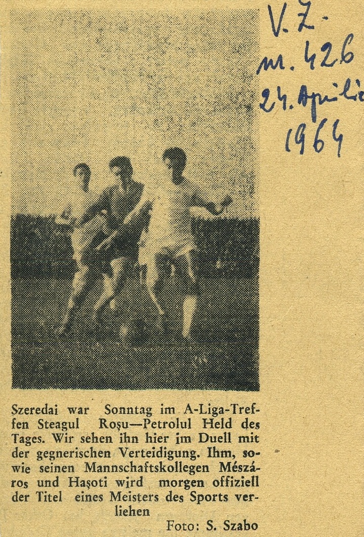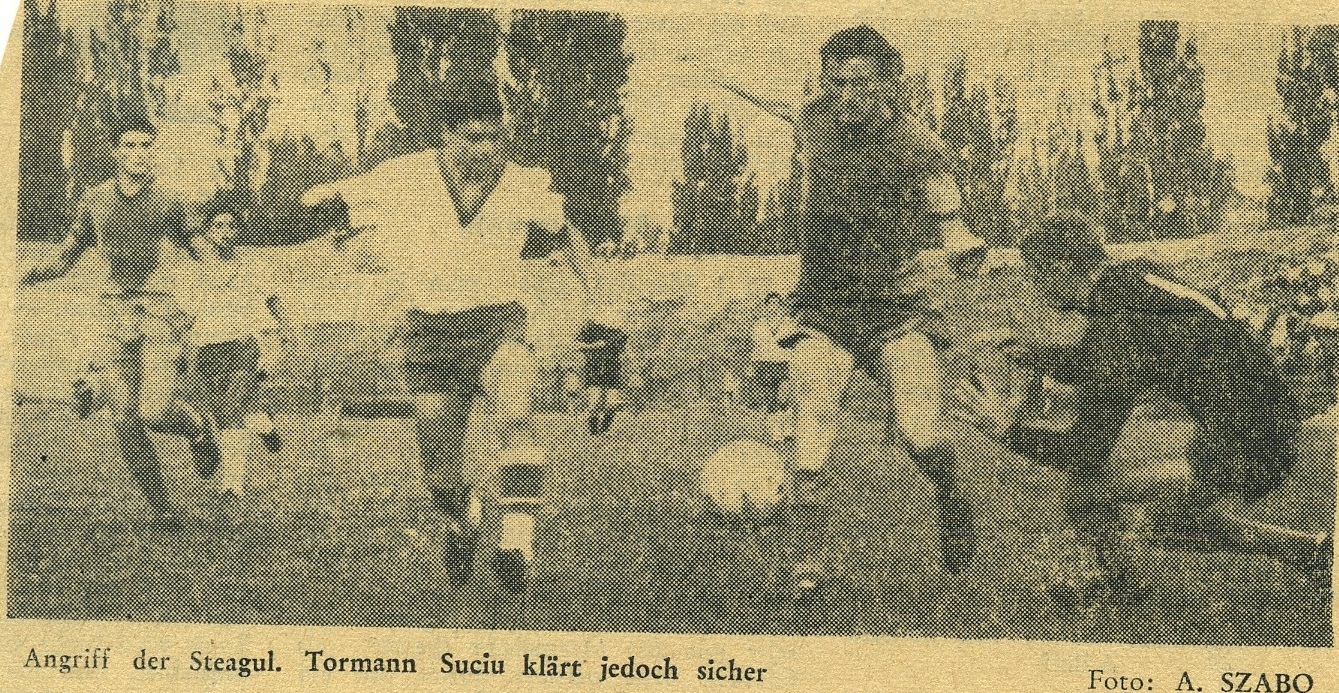 August. Amical pe „Tineretului” înainte de startul sezonului cu Fainţa Sighişoara. Zoltan David (tricou dungat), goneşte spre poarta sighişorenilor. Şi în această fotografie se poate observa foarte bine elegantul echipament de joc al „stegarilor” compus din tricouri albe cu dungi albastre, şorturi negre şi jambiere albe.