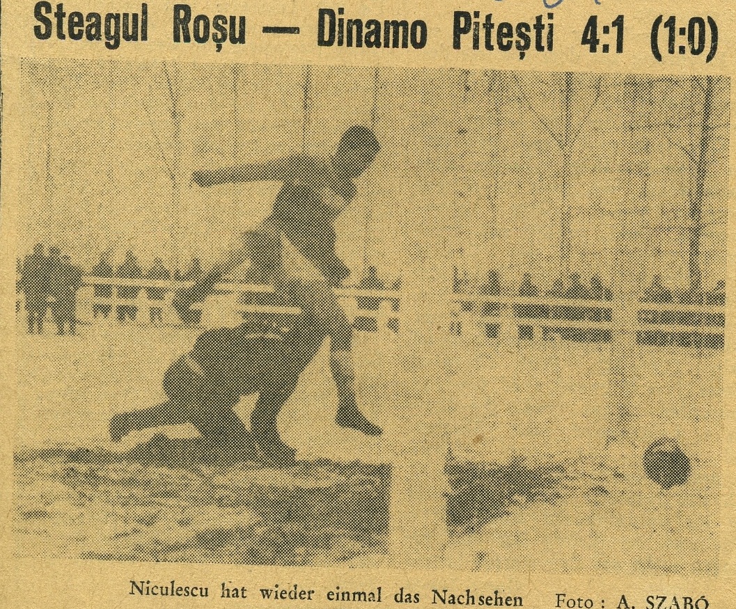 Luna noiembrie s-a încheiat pentru „stegari” cu un succes răsunător, 4-1, pe „Tractorul”, în faţa formaţiei Dinamo Piteşti (actuala FC Argeş). În fotografia de mai sus, Dorin Necula aproape că-l bagă pe portarul Niculescu în poartă deodată cu mingea.