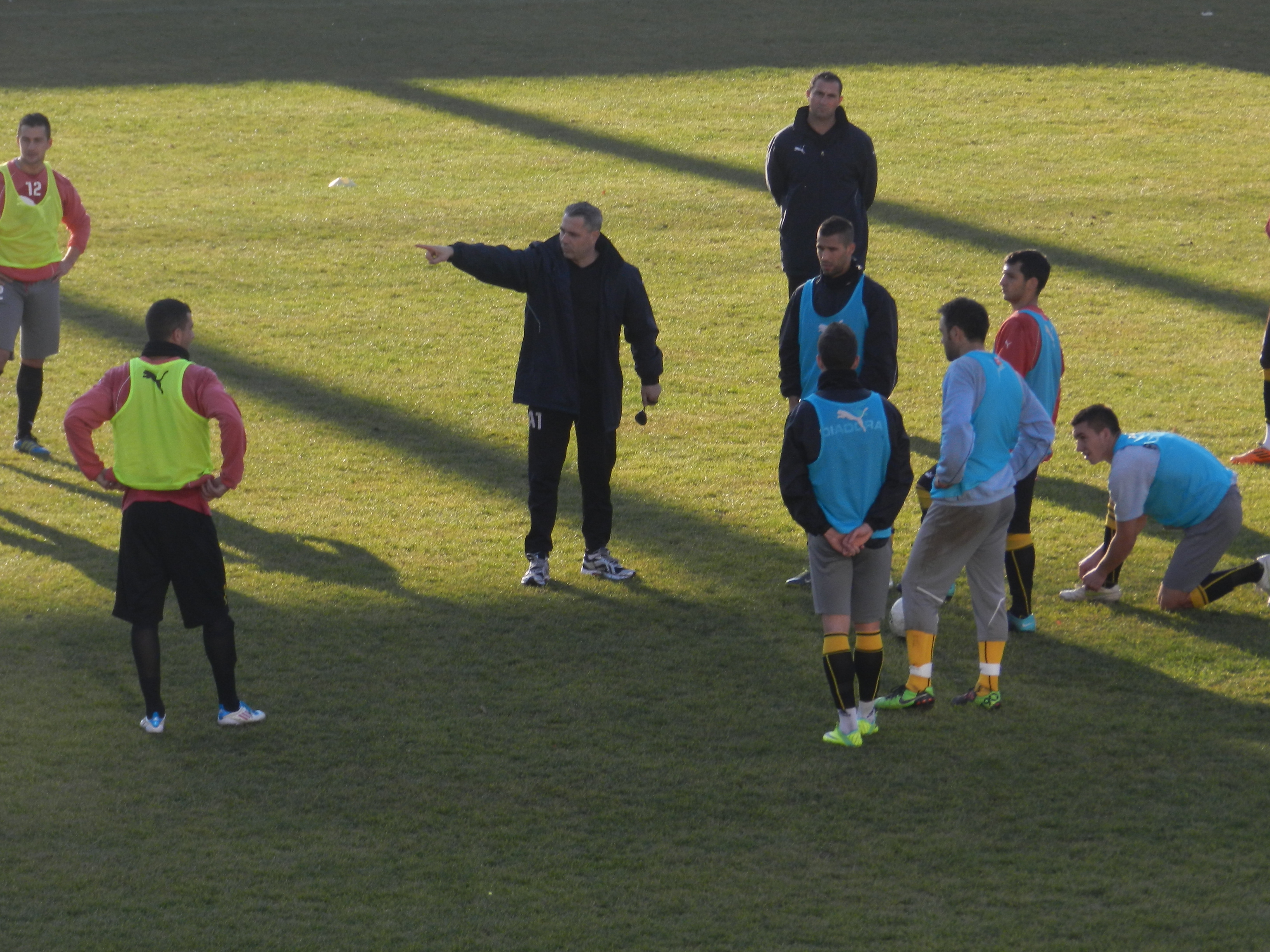 Şumudică (centru), explicându-le jucătorilor cum va decurge următorul exerciţiu.
