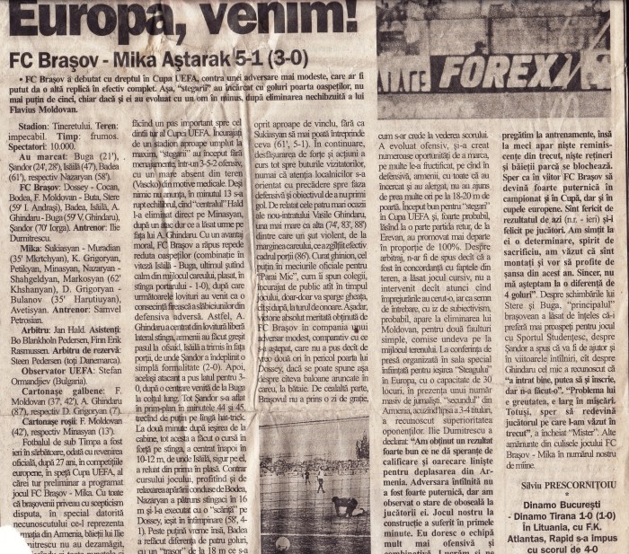 9 august 2001, la 29 de ani distanta, Steagu din nou in Cupa UEFA. Poate mai putin interesant decat acel retur de infarct cu turcii, meciul cu Mika Ashatarak a produs, totusi, multa bucurie in suflete de „stegomani”, inclusiv intr-al meu, prezent , de data asta, pe stadion, la Tribuna 1, foarte in stanga.