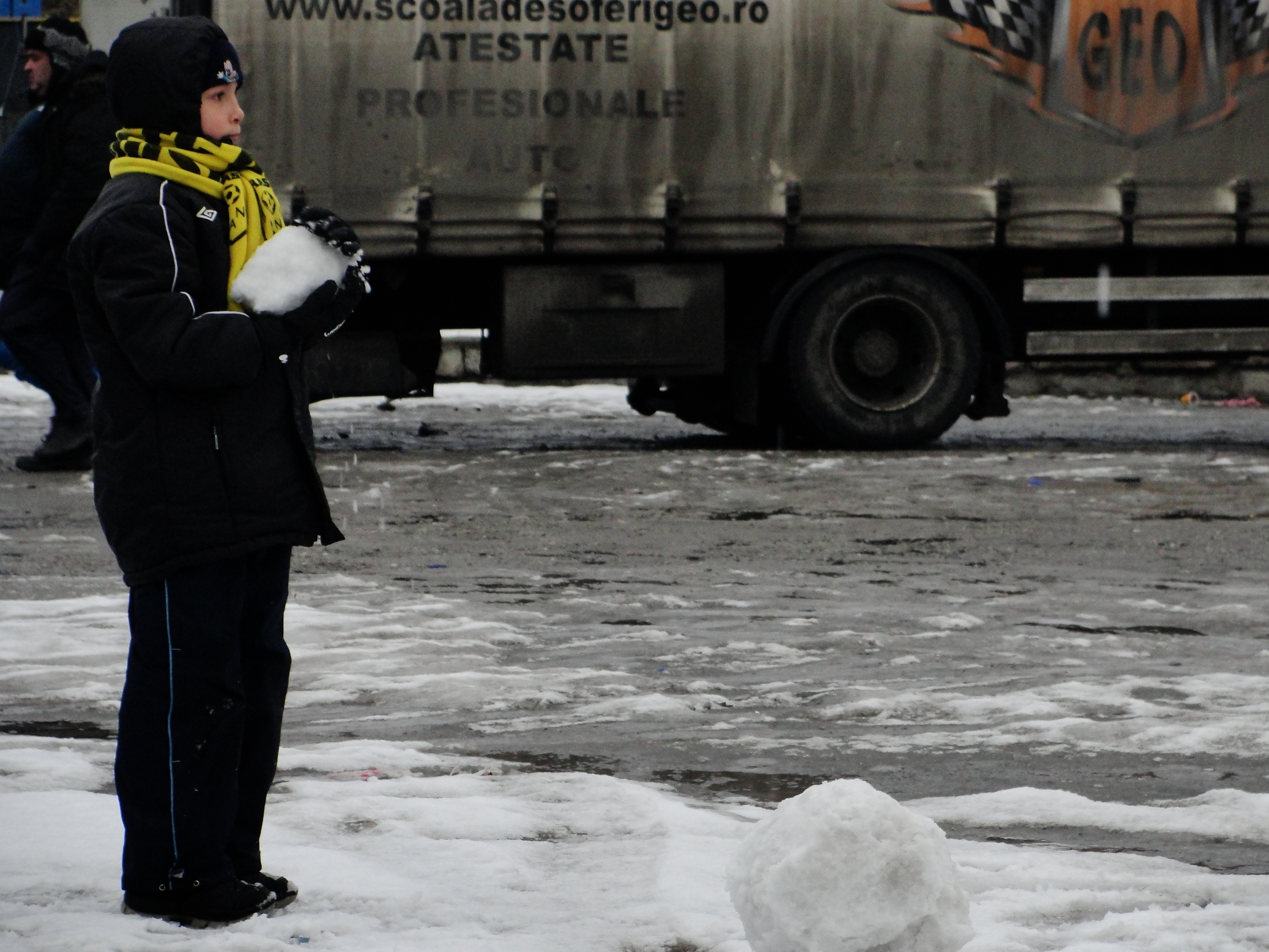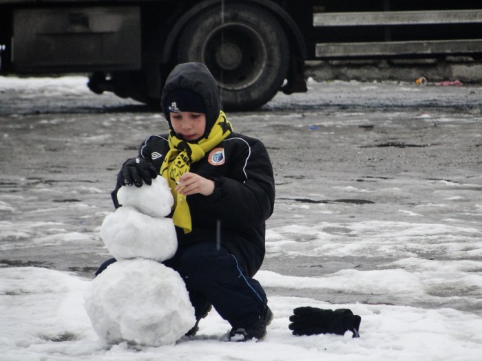 Se întâmpla în apropierea Stadionului „Silviu Ploeşteanu”. Eram într-un bar, îmi savuram Ciucaşul la sticlă printre fumuri de ţigară şi păreri aproape profesioniste despre cum o să fie returul ăsta pentru noi. Un prieten regreta că vremea friguroasă i-a stricat planul de a-şi duce iubita pentru prima dată pe stadion. Mediul în care eram în acel moment nu era în nici un caz potrivit pentru a iniţia o domnişoară cu tainele „zilei de meci”, aşa că, zâmbind, i-am spus prietenului că destinul, de fapt, i-a făcut o favoare prin vremea de afară. Am mai tras un gât de bere, mi-am aranjat gluga la hanorac şi m-am dus să mă uit pe fereastra barului. Voiam să văd stadionul. În schimb, văd un copil. Cu o eşarfă galben-neagră la gât şi căciula trasă bine peste urechi, acesta meşterea de zor prin zăpada din faţa terasei barului. În lipsa tatălui, care servea o cafea împreună cu alţi gentlemeni „stegari” lângă un chioşc, copilul rostogolea prin zăpadă bulgări de zăpadă până ce aceştia deveneau cât de mari dorea el. Apoi, cu migală de artist, îi aşeza unul peste celălalt şi netezea cu palma zonele mai colţuroase. Nu ştiu de ce, dar am denumit omuleţul de zăpadă al micuţului „stegar” Adamache. Ivăncescu, Năftănăilă, Dossey, Proca, Drăgan, Campo, Ploeşteanu…