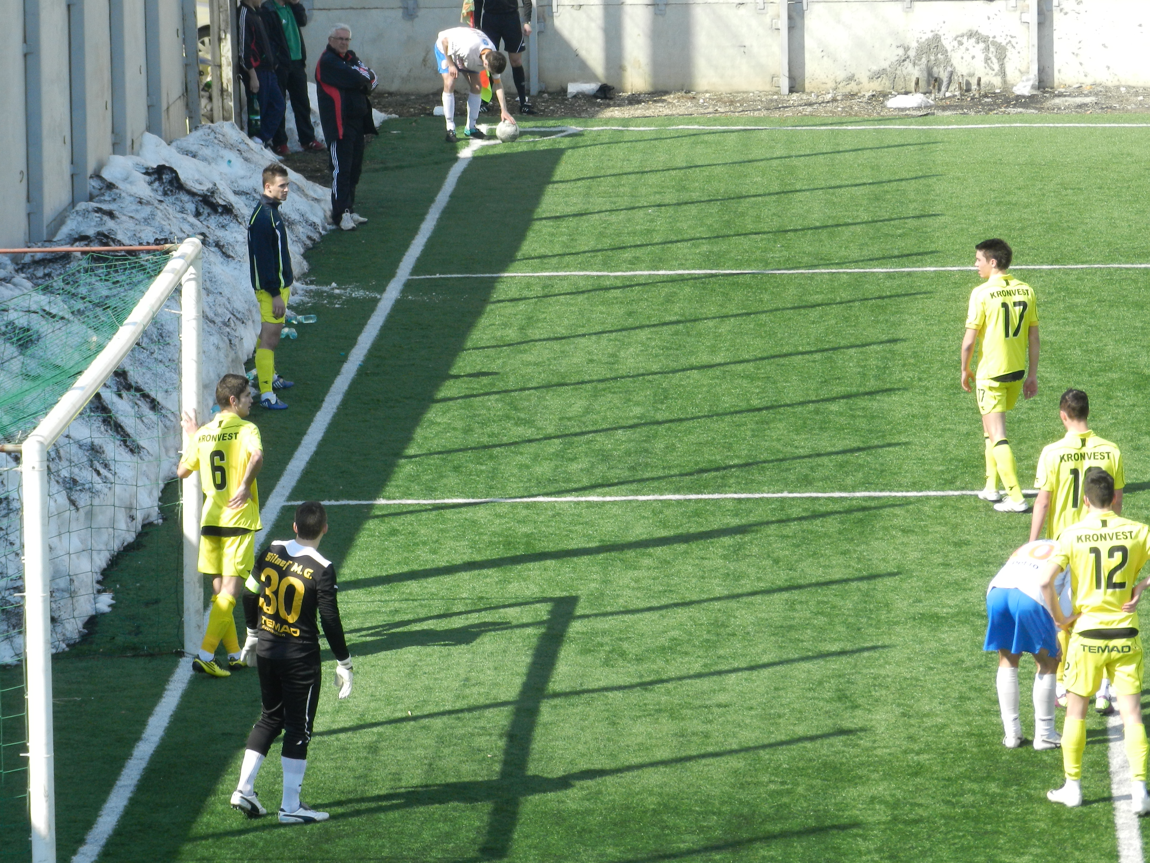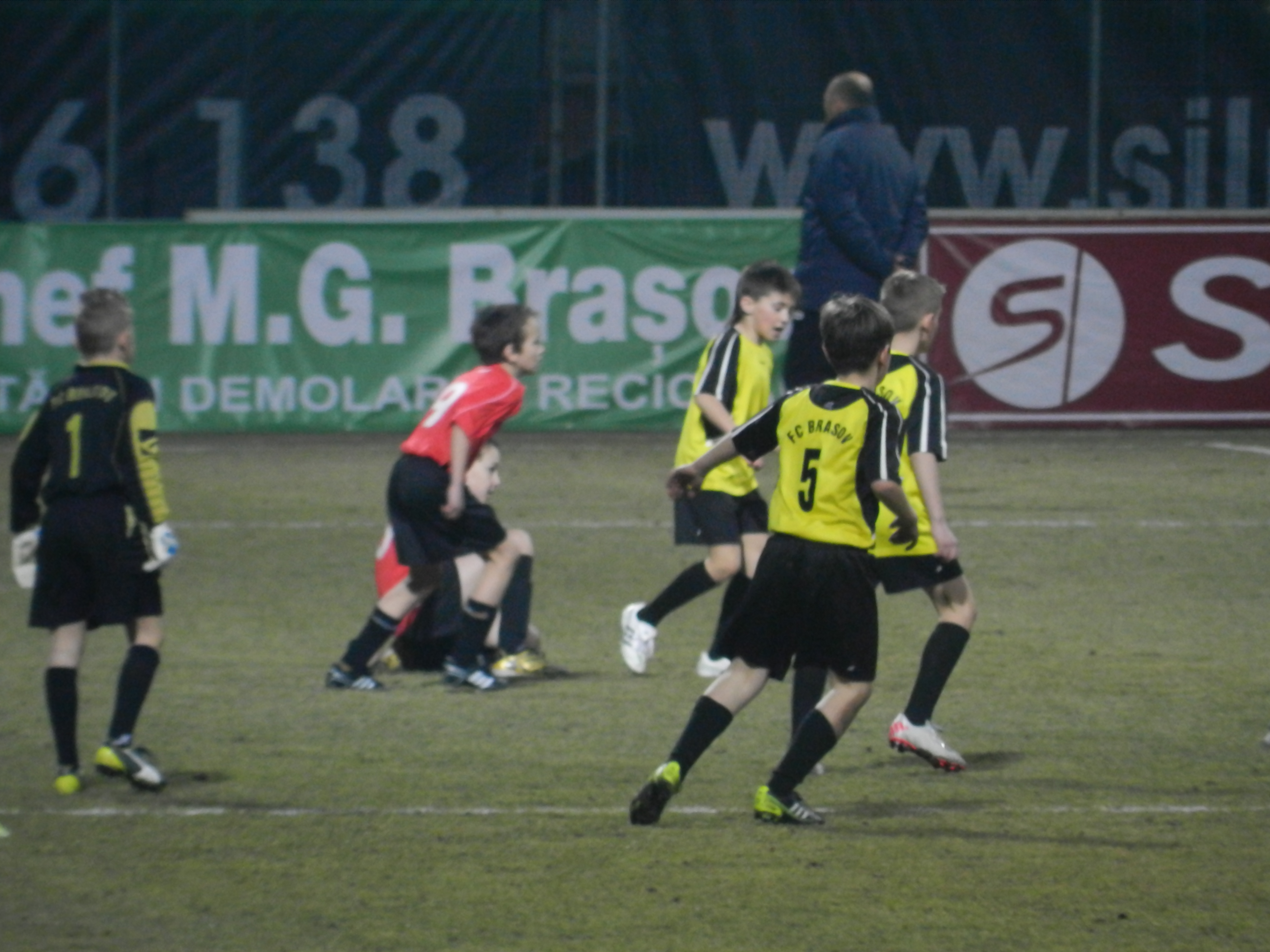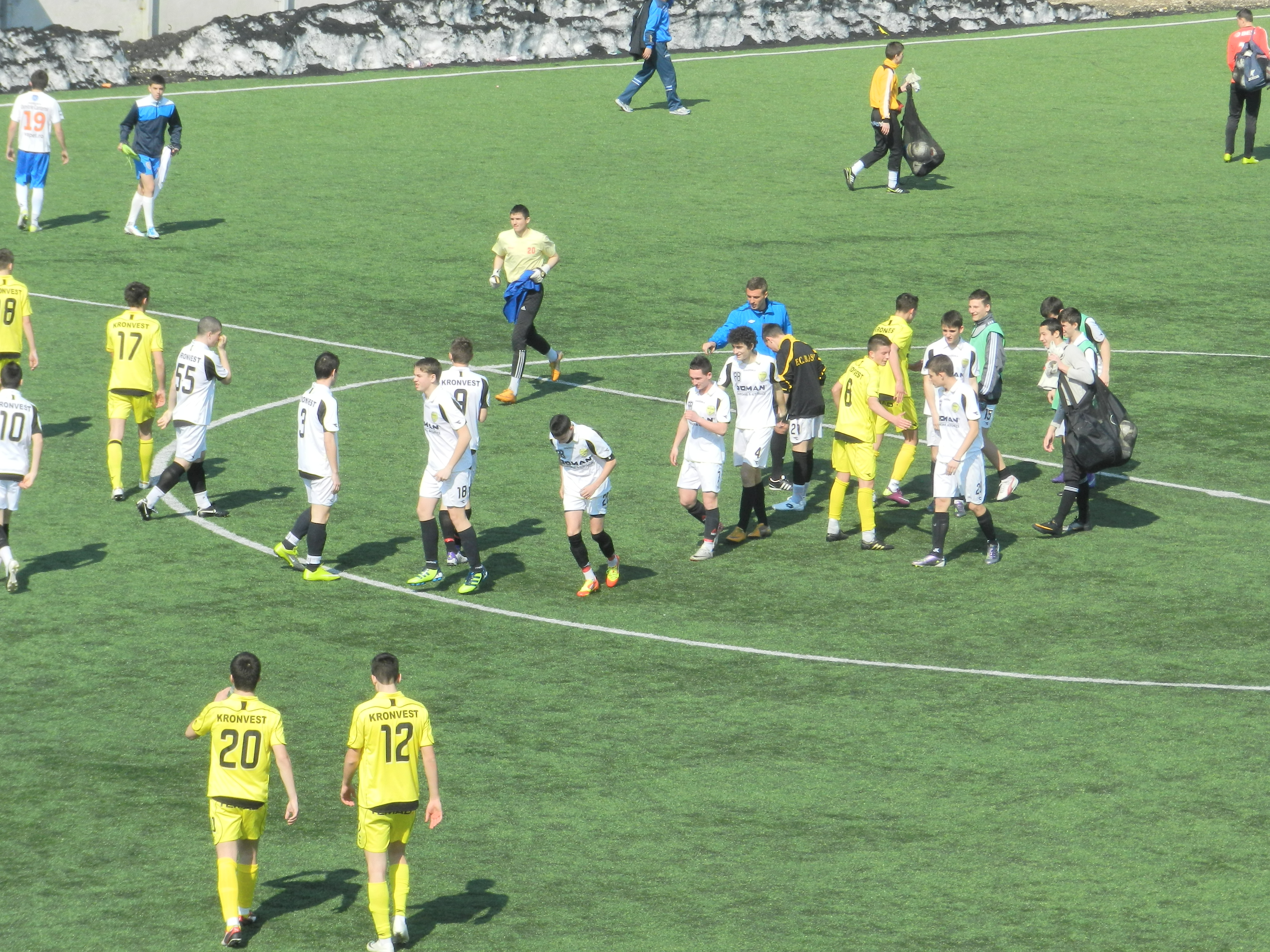 Meciul a început de la 12 fix. Eu am ajuns de la repriza a doua, când scorul era deja 1-1. S-a jucat pe sinteticul de lângă, întrucât terenul de iarbă al ICIM-ului era în curs de deszăpezire. Am luat loc undeva în înaltul scheletului de metal al neterminatei tribune şi m-am pus pe fotografiat şi observat. Repriza mi s-a părut a fi destul de echilibrată, cu o uşoară dominare de partea „stegarilor”. În tribună, părinţii veniţi să-şi vadă copiii la meci erau destul de activi în a comenta răbufnirile cu ecou ale antrenorului, iar o mamă mi-a lăsat impresia că „dreacu’ ” e ticul ei verbal. Oricum, interesant meciul văzut din această perspectivă.