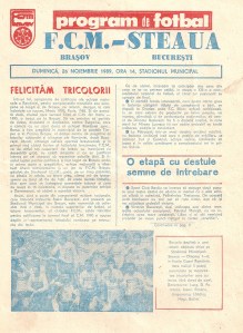În acest context, pe 26 noiembrie 1989, Steaua venea la Braşov pentru a juca cu FCM în etapa a XII-a a campionatului. Programul de meci, de la care a pornit şi ideea acestui articol, pare mai de grabă editat de oaspeţi. Culorile alese la tipărire, roşu şi albastru, par de-a dreptul sinistre în raport cu calitatea noastră de gazde. Redactorii programului, Ioan Bara şi „e.h.” (probabil Eduard Huidan), au înţesat cele opt pagini cu articole despre Steaua. Ne putem delecta cu prezentarea echipei oaspete, istoricul duelului Steaua-Dinamo, Steaua şi Dinamo în Cupele Europene, portretul jucătorilor Lăcătuş şi Balint, precum şi felicitări adresate steliştilor de la echipa naţională pentru calificarea la Turneul Final din Italia 90. Nici un rând despre lotul stegarilor, despre echipa probabilă sau un îndemn adresat suporterilor. Undeva prin pagina a şaptea, o fotografie modestă ni-l prezintă pe Gelu Moldovan, cu explicaţia „forţă, dârzenie, tenacitate şi ambiţie la un singur jucător”, iar alături, Marin Barbu, căpitanul stegarilor. Într-o scurtă prefaţare a meciului „e.h.” scrie : „pe stadionul Municipal din Braşov, un meci de atracţie, cu Steaua Bucureşti în postură de favorită, prin valoarea lotului şi poziţia ocupată în fotbalul românesc şi internaţional, având în FCM Braşov un adversar dornic să contribuie la realizarea unui meci de calitate, să nu-şi dezamăgească suporterii şi să încerce, cu sportivitate, producerea …surprizei.” Rânduri scrise cu mănuşi, nimic de genul: „Pe ei, pe mama lor !”. Unde mai pui că preţul de vânzare al programului, separat de biletul de intrare, era 10 lei. Curată speculă, în condiţiile în care, spre exemplu, ziarul Sportul îl cumpărai de la chioşc cu 50 de bani.