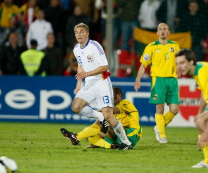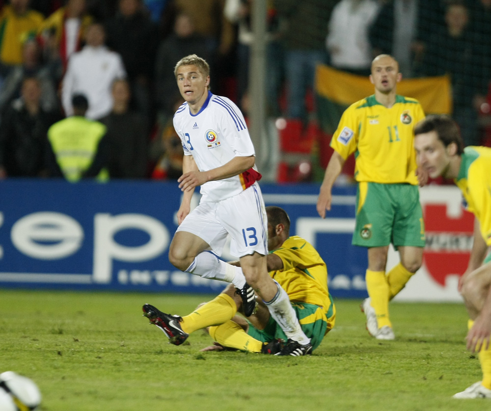Mihai Roman (alb) într-o fază a meciului din deplasare cu Lituania, din preliminariile Cupei Mondiale Africa de Sud 2010 – meciul său de debut.