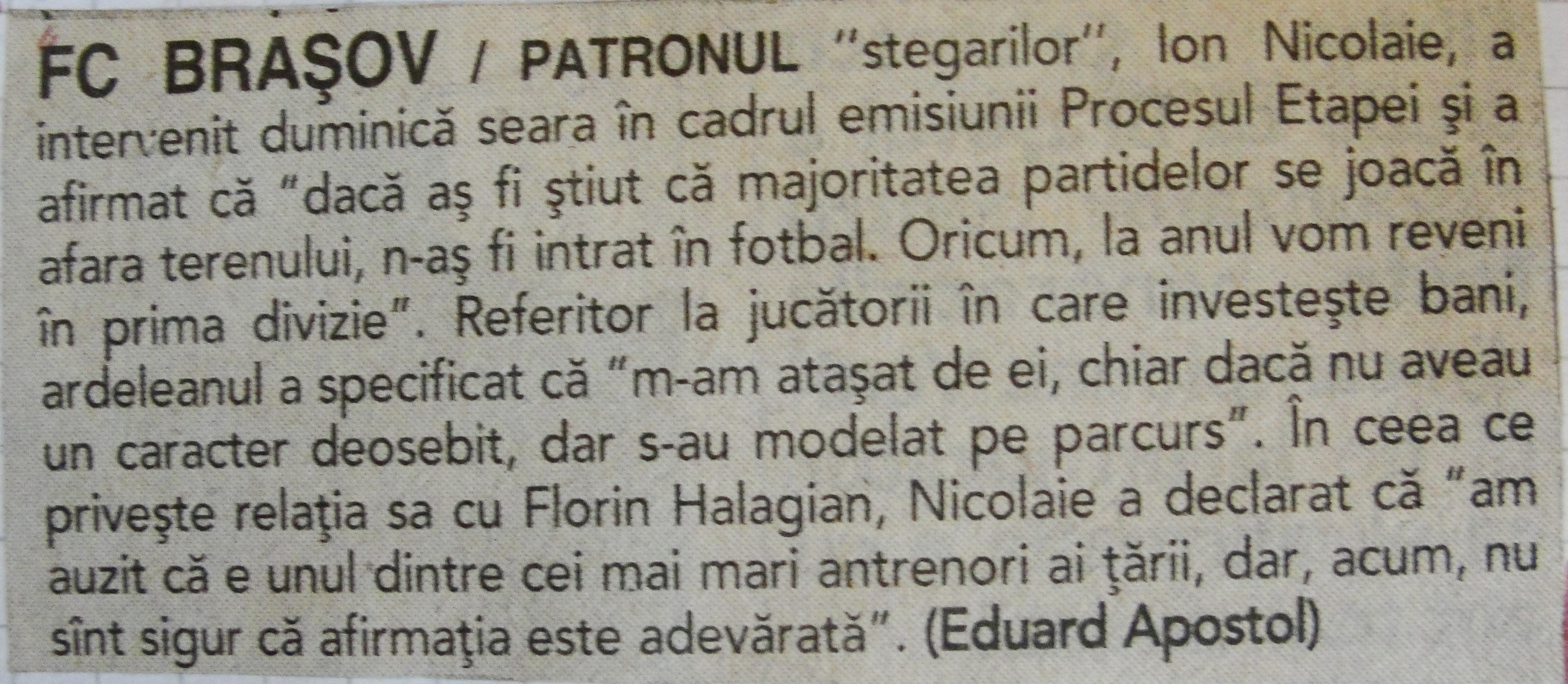 „Ajuns în ochii opiniei publice unul dintre simbolurile blaturilor din fotbalul românesc, antrenorul Florin Halagian a părăsit pe FC Braşov, motivând că este bolnav. Ion Nicolaie (n.a. Patronul) , finanţatorul clubului de sub Tîmpa, dă de înţeles că acesta este sfîrşitul relaţiei cu Halagian.