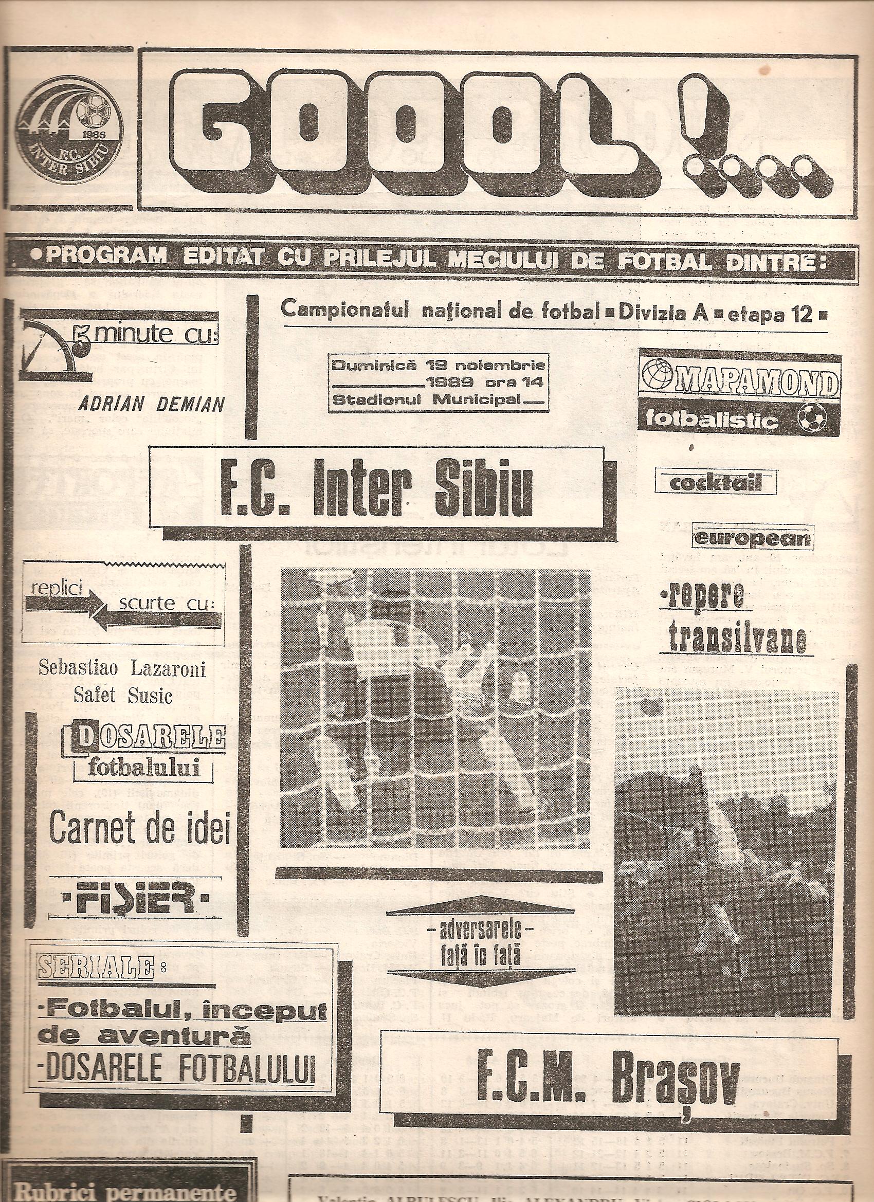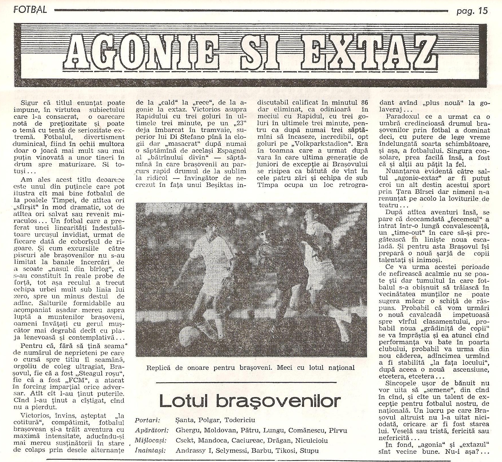 Unde vreau să ajung ? Pe 19 noiembrie 1989, FCM Braşov se deplasa la Sibiu, pentru meciul din etapa a 12-a cu echipa locală, Inter. Nu am fost la acea partidă, în schimb am intrat în posesia programului de meci editat de gazde. Un program cât o adevărată revistă, cu 16 pagini bine scrise, cu prezentarea echipelor, statistici, istorie, fotbal internaţional. Cel mai mult mi-a plăcut, însă, un editorial despre echipa braşoveană şi istoria ei, văzute din perspectiva microbistului sibian. Se simte în tonul articolului, chiar şi sub masca unei obiectivităţi aparente, o undă de solidaritate cu echipa noastră. Se prea poate, ca în timpul lungilor perioade de absenţă a Sibiului de pe prima scenă fotbalistică, sibienii să fi privit spre Braşov şi Steagul Roşu cu interes şi simpatie. Articolul, intitulat” Agonie şi extaz” surprinde suişurile şi coborâşurile echipei noastre, echipă care ne-a purtat, în timp, prin toate stările posibile. Vă invit să citiţi articolul în variantă scanată. Mai puteţi vedea în imagine lotul braşovenilor pentru acel meci şi o fotografie de la o partidă de pregătire dintre FCM Braşov şi echipa naţională.