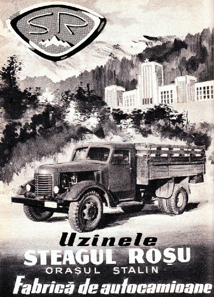 Am mai scris despre cum comuniştii au încercat din răsputeri să şteargă identitatea oraşului, schimbându-i numele şi străzile şi tot ce amintea de „vechea orânduire burgheză” (aka regalitate). La ieşirea din Oraşul Stalin, cum făceai dreapta pe Calea Moscovei, dădeai peste Uzinele „Steagul Roşu”. Pe la mijlocul anilor 1950, acolo au început să se facă autocamioane, iar afişul de prezentare chiar n-arată rău deloc.