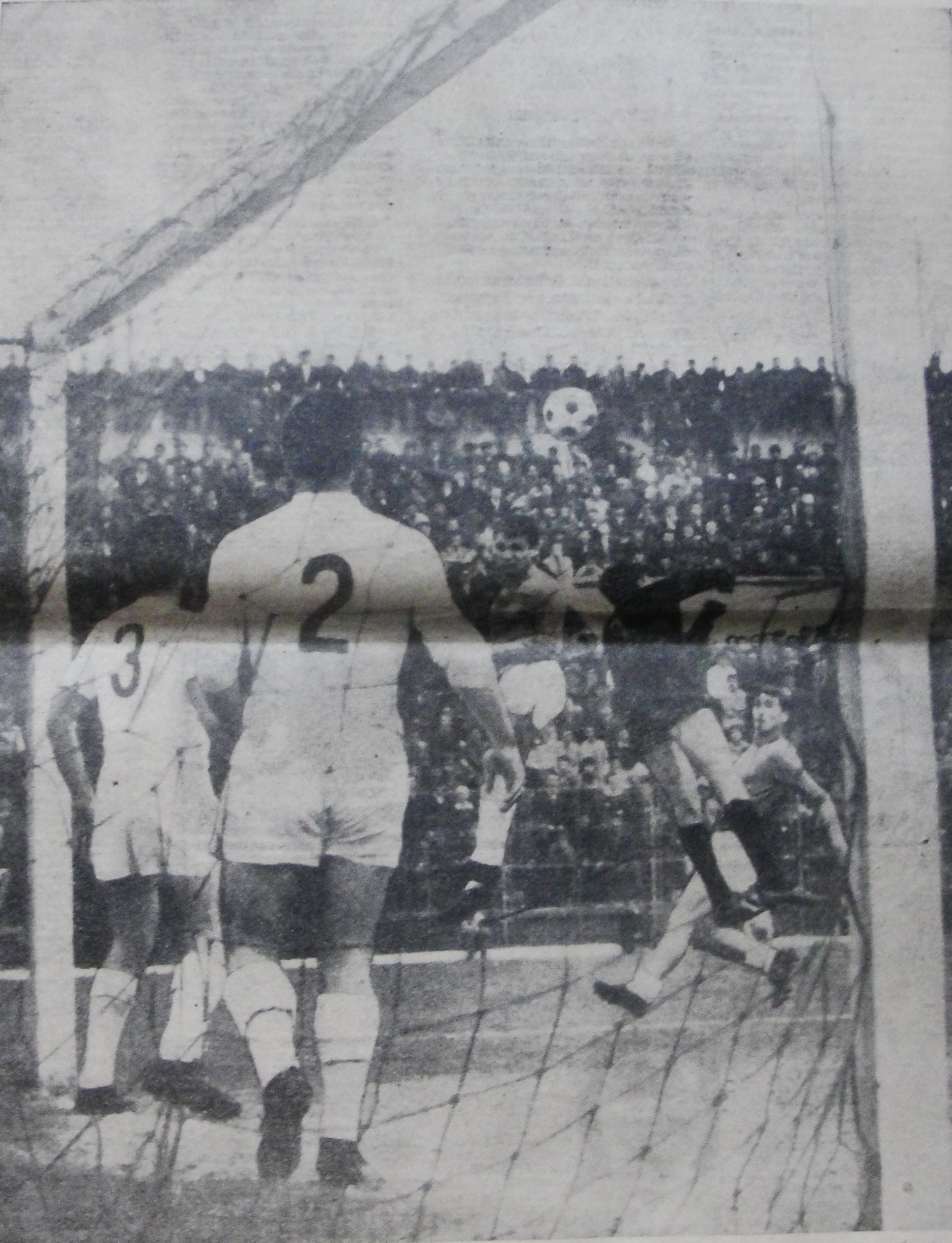 Goran (în săritură) se luptă cu portarul dinamoviştilor bucureşteni, Datcu (negru complet), pentru minge. „Cucu” Jenei, fundaşul central, venit în sprijinul atacului, urmăreşte respingera. S-a terminat 1-0 pentru noi.