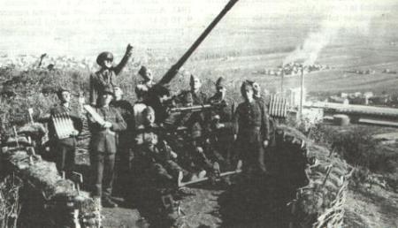 Tun anti-aerian Rheinmetall de calibrul 37 mm fabricat de Uzinele „Astra” Braşov pe Dealul Melcilor. În spate, cartierul Astra aşa cum arăta în mai 1943. sursa:cartula.ro