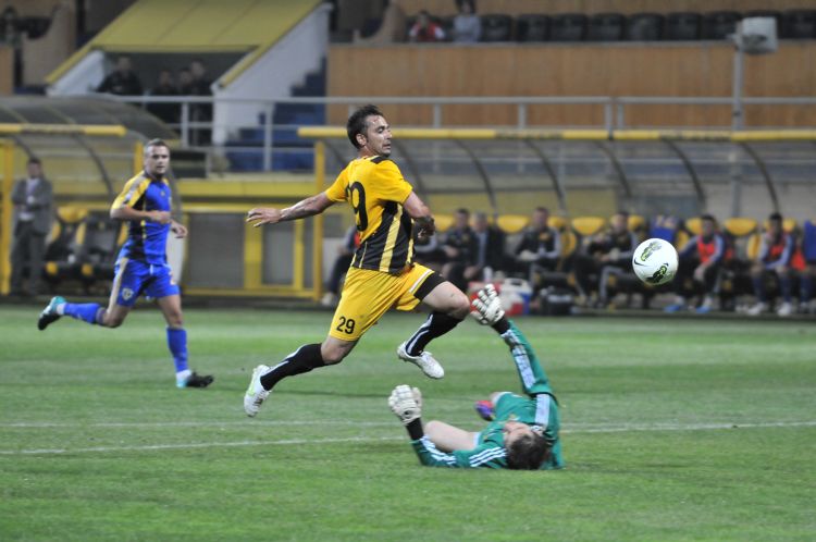 Momentul dinaintea extazului. Mugurel „Pele” Buga construieşte o scăriţă peste portarul ploieştean şi înscrie golul ultimei victorii braşovene. Bogdan Străuţ (plan îndepărtat), actualul fundaş lateral „stegar”, priveşte neputincios. foto de Bogdan Bălaş