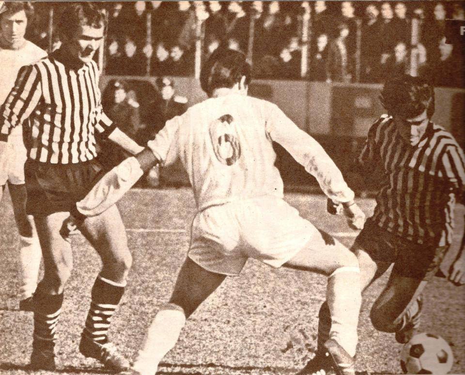 1972: „Cu Pescaru în echipă şi cu Györfy pe extremă”. După ce marcase în meciul de la Bucureşti, din tur, terminat 2-2, emblematicul Nicolae Pescaru (la minge) este decisiv în jocul de la Braşov, din 19 martie, pasându-i lui Györfy pentru restabilirea egalităţii în ’58 şi marcând golul decisiv în ’71. sursa foto: Marian Olaianos
