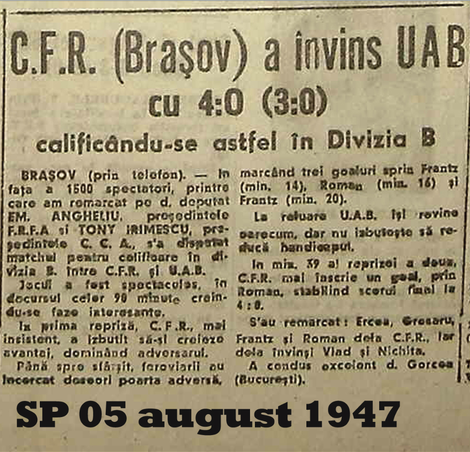 3 august 1947, primul asalt – era prima tentativă postbelică a Uzinelor Astra de a se califica în Divizia B. Din păcate, derby-ul local urmărit de 1500 de spectatori este pierdut în faţa vechilor adversari feroviari cu 4-0. (sursa: Sportul Popular din 5 august 1947)