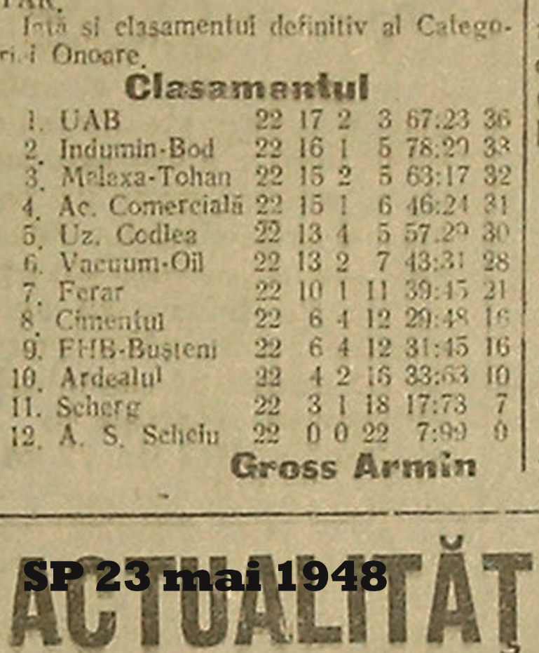 În barajul de promovare pentru Divizia A, Uzinele Melarugice Cugir (Seria a II-a) vs Uzinele Astra Braşov, 5-0 şi 1-1. (sursa)