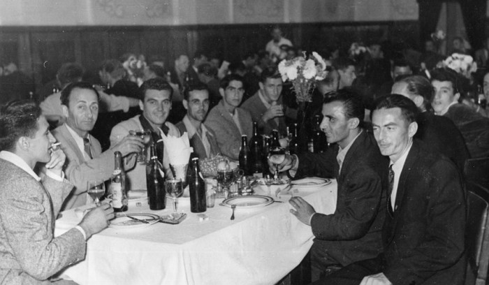 Dineul din 4 septembrie 1956. Petrecăreţii, de la stânga la dreapta: braşoveanul Gheorghe Percea, chişinăuanul Beglearov, Emanoil Haşoti, Ponomariov, Ţinkler şi Lev Şor. De partea celaltă a mesei se află arbitrul meciului, Ilie Catănsus, posibil să fie „stegarul” Kneipp, iar puştiul din spate de tot, care se uită spre cameră, este braşoveanul Gheorghe Ciripoi; foto din arhiva lui Lev Şor, via