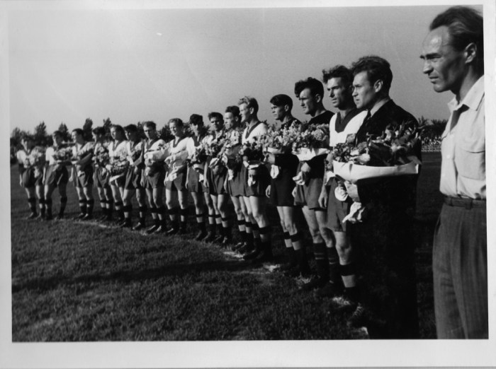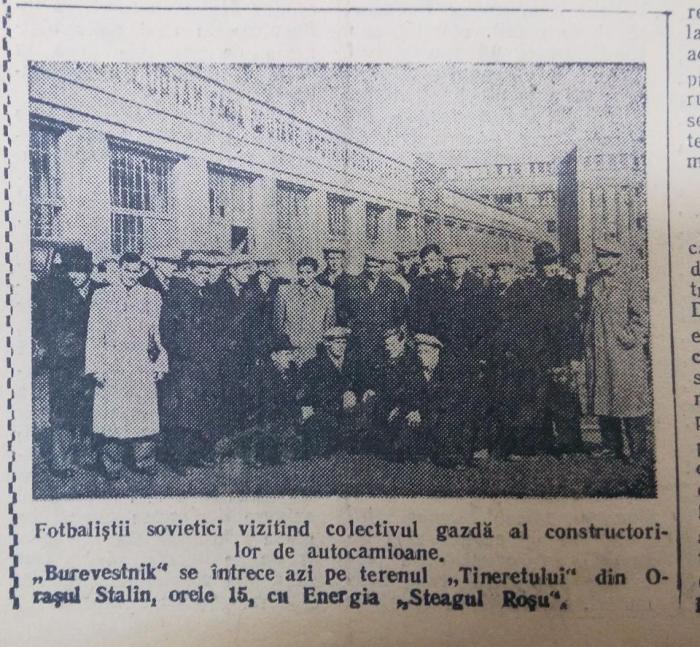 3 septembrie 1956. Energia Steagul Roşu Oraşul Stalin aliniată la centrul terenului, înaintea meciului cu Burevestnik. Calitatea nu foarte grozavă a fotografiei face dificilă identificarea tuturor „stegarilor”, dar se remarcă următorii: de la stânga la dreaptă, în tricou alb, Silviu Ploeşteanu, Gheorghe Marinescu, portarul Tică Constantinescu, Nicolae Proca, ???, portarul de rezervă Constantin Ghiţă, Zoltan David, Gheorghe Ciripoi, Nicolae Fusulan, ???, posibil Kneipp, Octavian Zaharia, Gheorghe Percea, ??? şi Emanoil Haşoti; foto de S. Galperin via