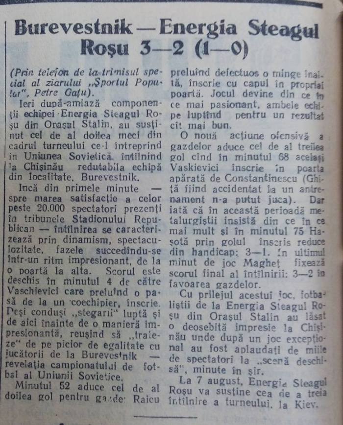 Pe 25 iulie 1957, un arhiplin stadion „Republican” (25 de mii de spectatori) întâmpina echipele Burevestnik Chişinău şi Energia Steagul Oraşul Stalin, pregătite pentru a treia confruntare directă din istorie. Lotul „stegar” deplasat în capitala Basarabiei a fost următorul: portarii Constantin Ghiţă, Tică Constantinescu şi Vasile Câmpeanu, fundaşii Gheorghe Bârsan, Gheorghe Marinescu şi Gheorghe Percea, mijlocaşii Octavian Zaharia şi Paul Popescu, atacanţii Emanoil Haşoti, Ioan Szigety, Gheorghe Fusulan, Zoltan David, Nicolae Proca şi Gheorghe Ciripoi.