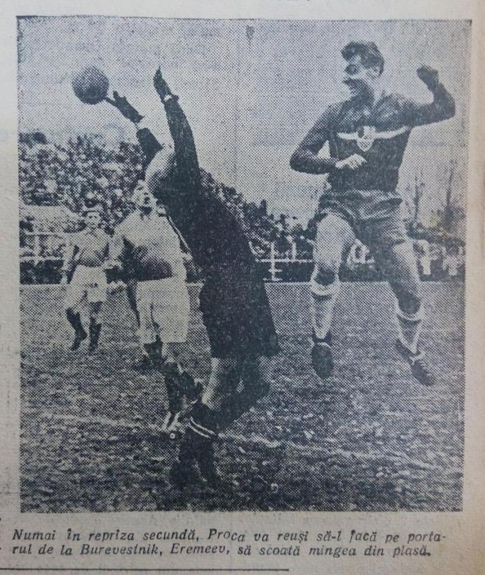 Fotografie cu Proca marcând golul de 2-3 apărută în Drum Nou (8 noiembrie 1956); sursa foto: Arhivele Bibliotecii Judeţene Braşov, via Adi „MicşunicaZone” Aliman