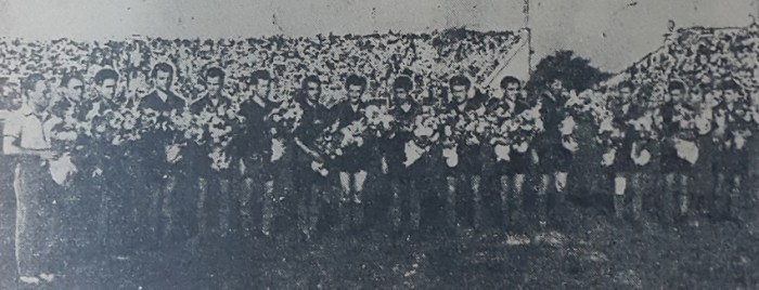 „Stegarii” la centrul terenului înaintea meciului din 3 august 1957. Primul din dreapta este antrenorul Silviu Ploeşteanu; sursa foto: Laura Ploeşteanu