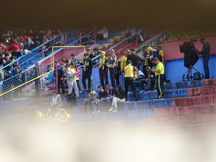 Printr-o crăpătură în două plăci de beton, i-am surprins pe „stegari” lecturând programul de meci, cel cu pagina despre 7-0-ul din ’77. 2-0 pentru localnici.