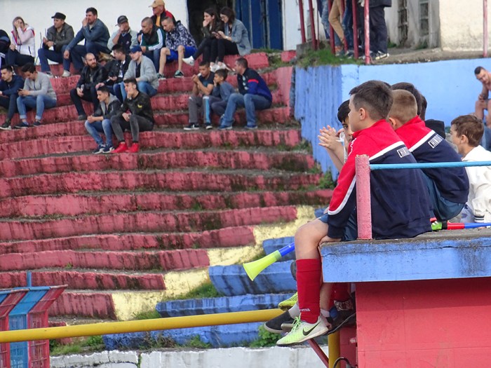 Copiii clubului ce mai trompetau din când în când de pe terasa din mijlocul tribunei. Peluza din plan îndepărtat face valuri de la sine, dacă fanii proprii sunt prea comozi.
