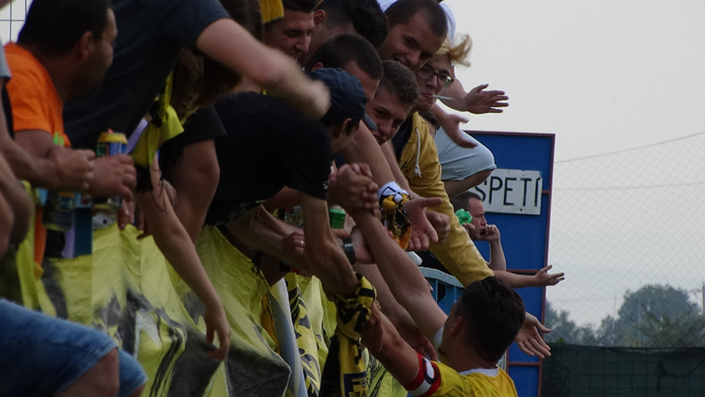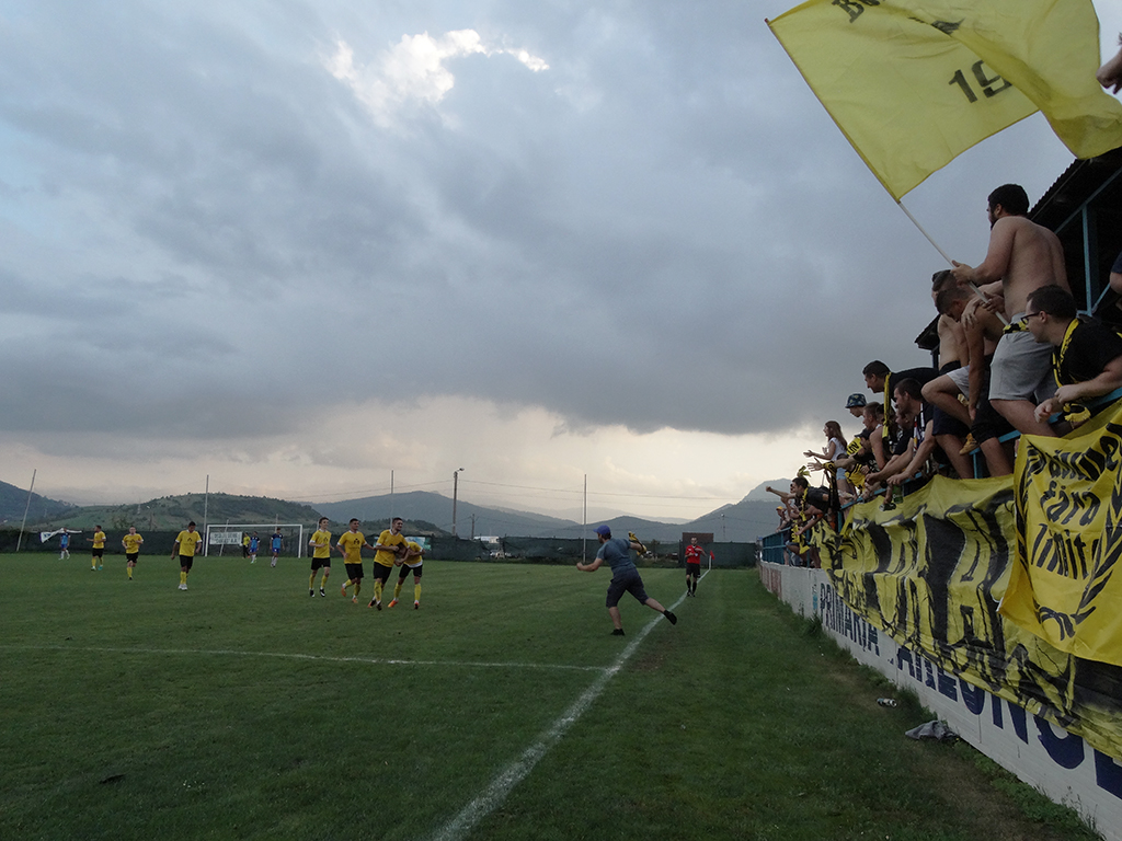 8 august 2017, Tărlungeni. Alex Vîrlan celebrând alături de suporterii „stegari” golul de 2-1 al amicalului contra Progresul Spartac Bucureşti.