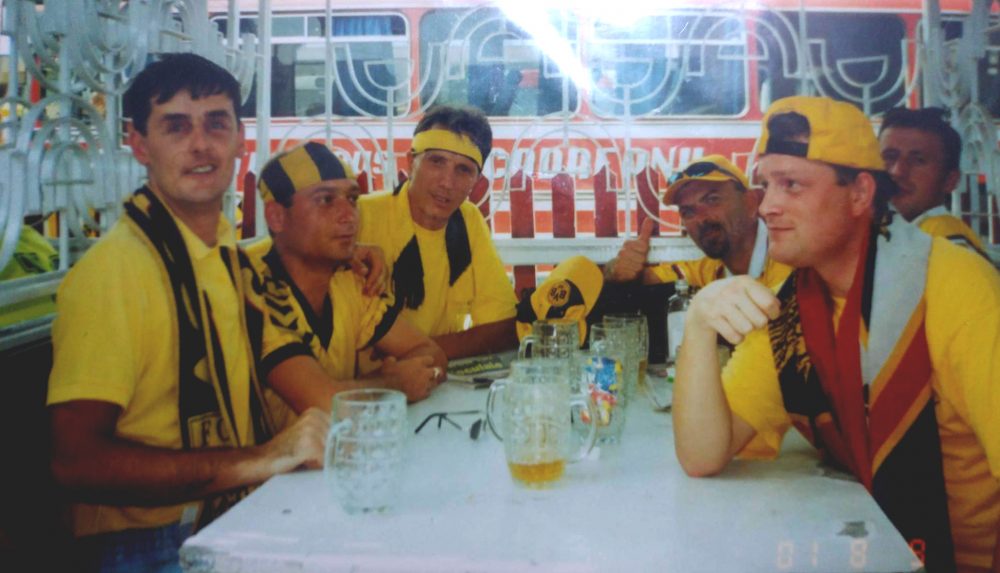Horaţiu (stânga) şi Cico (dreapta) cu băieţii înaintea meciului cu Mika Asharak din turul preliminar la Cupei UEFA, în august 2001