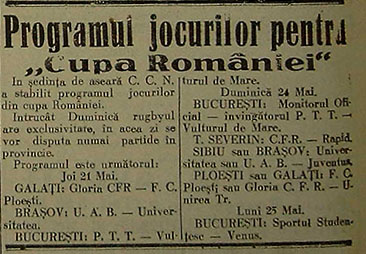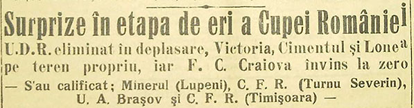 Etapa de eri a Cupei României n’a fost lipsită de suprize. Începând cu înfrângerea U.D.R.ului la Turnu Severin şi terminând cu victoria U.A.B.-ului la Turda, aceste rezultate au făcut ca etapa să fie agitată.”